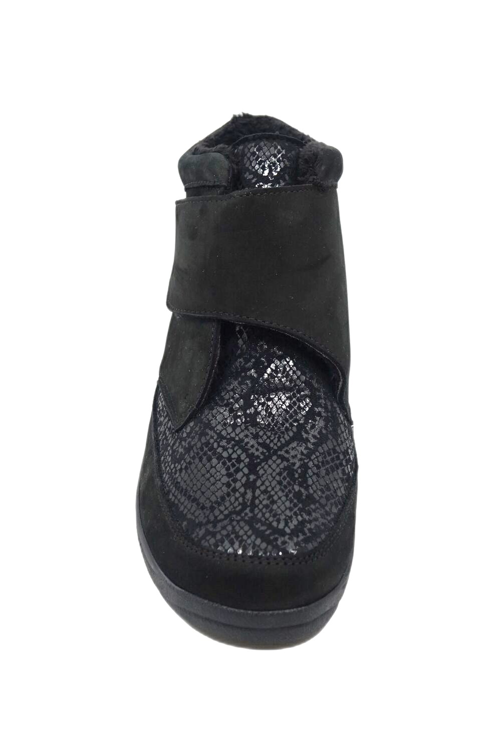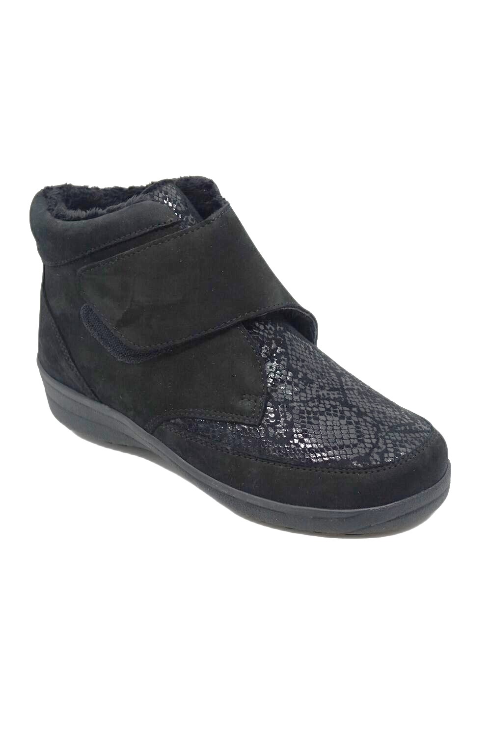 Botki COMFORTABEL 991545 czarny to damskie szerokie, wygodne obuwie wykonane ze skóry nubukowej. Przednia część cholewki wykonana jest z elastycznego stretchu, który dopasowuje się do deformacji tj haluks czy palce młotkowate inie powodując ucisku, ani otarć. Szeroki pasek zapinany na rzep pozwala wyregulować tęgość i dopasować buta do stopy. Wewnątrz botek jest ocieplony wyściółką typu VELUTO TERMO. Wkładka miękka pokryta delikatnym polarem zapewnia komfort stopie. Jest możliwość wyjęcia wkładki. Podeszwa z delikatnym koturnem, lekka , elastyczna wykonana z wysokiej jakości tworzywa .Posiada dobrą przyczepność do podłoża . Amortyzuje wstrząsy podczas chodzenia. W ofercie mamy też kapcie na haluksy.