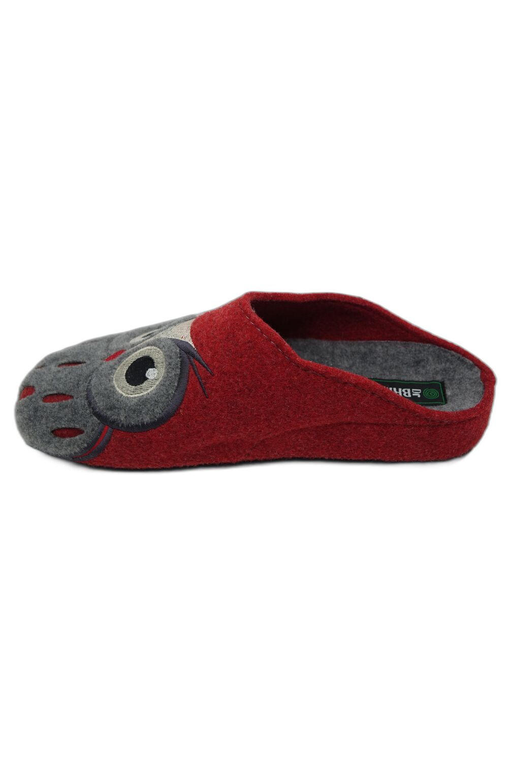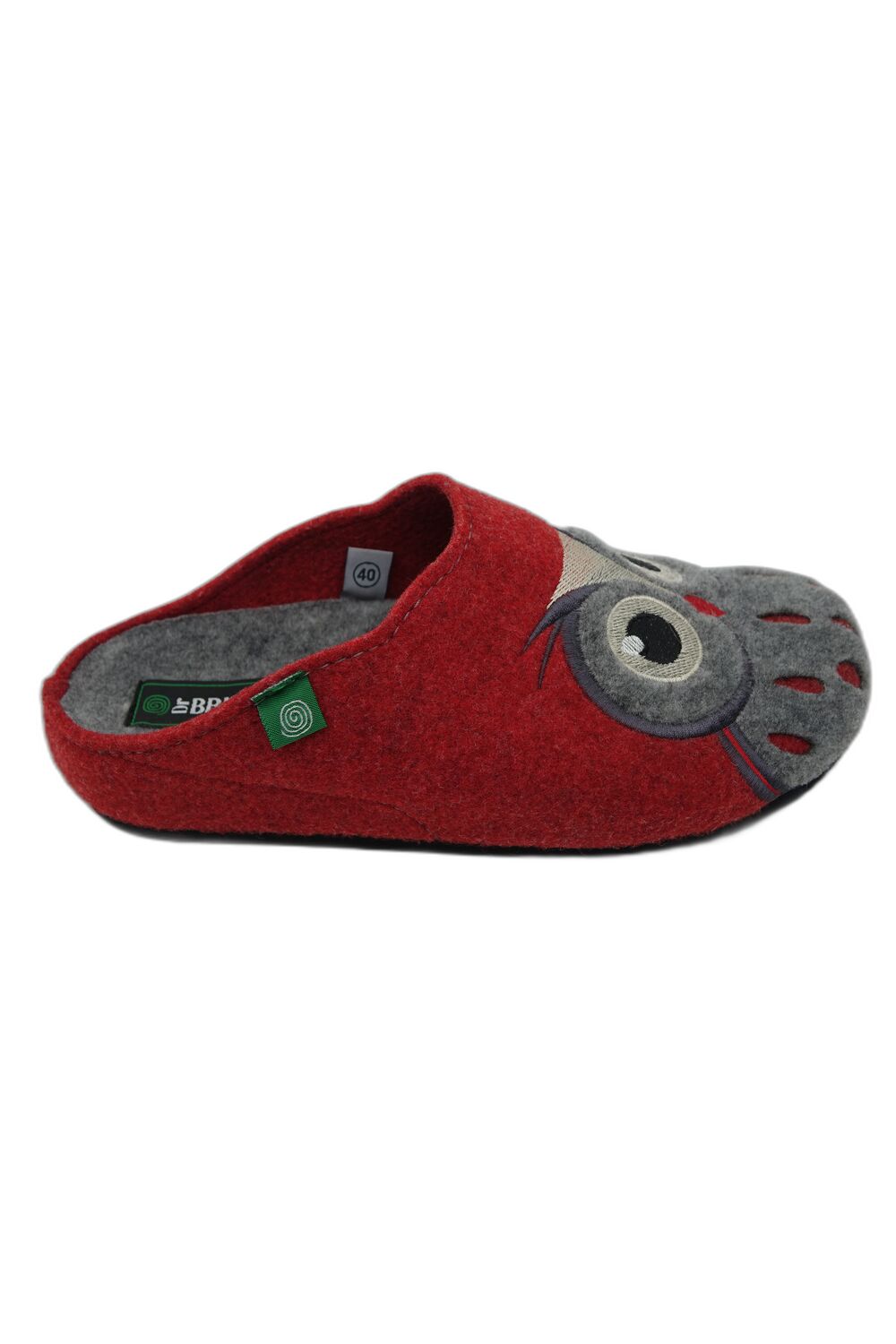 Kapcie BRINKMANN 320455 czerwony to wygodne damskie obuwie domowe wykonane z wysokiej jakości filcu. Przód cholewki zdobi motyw sowy. Wkładka delikatnie wyprofilowana, wykonana jest z miękkiego filcu, Profil podpiera łuk stopy oraz palce odciążając je i zapewniając uczucie komfortu. Dzięki temu,że wkładka jest miękka kapcie te sprawdzą się też przy ostrodze piętowej. Podeszwa powleczone jest filcem posiada lekko podwyższony obcas. W ofercie mamy też buty na szeroką stopę i wysokie podbicie.