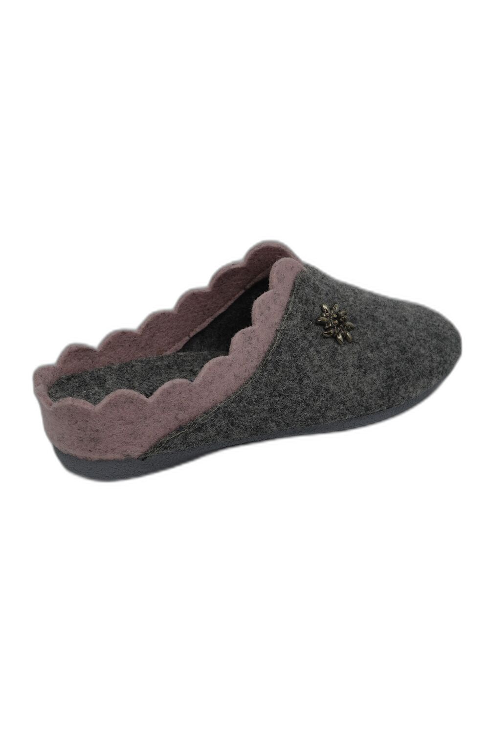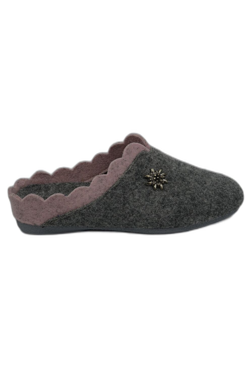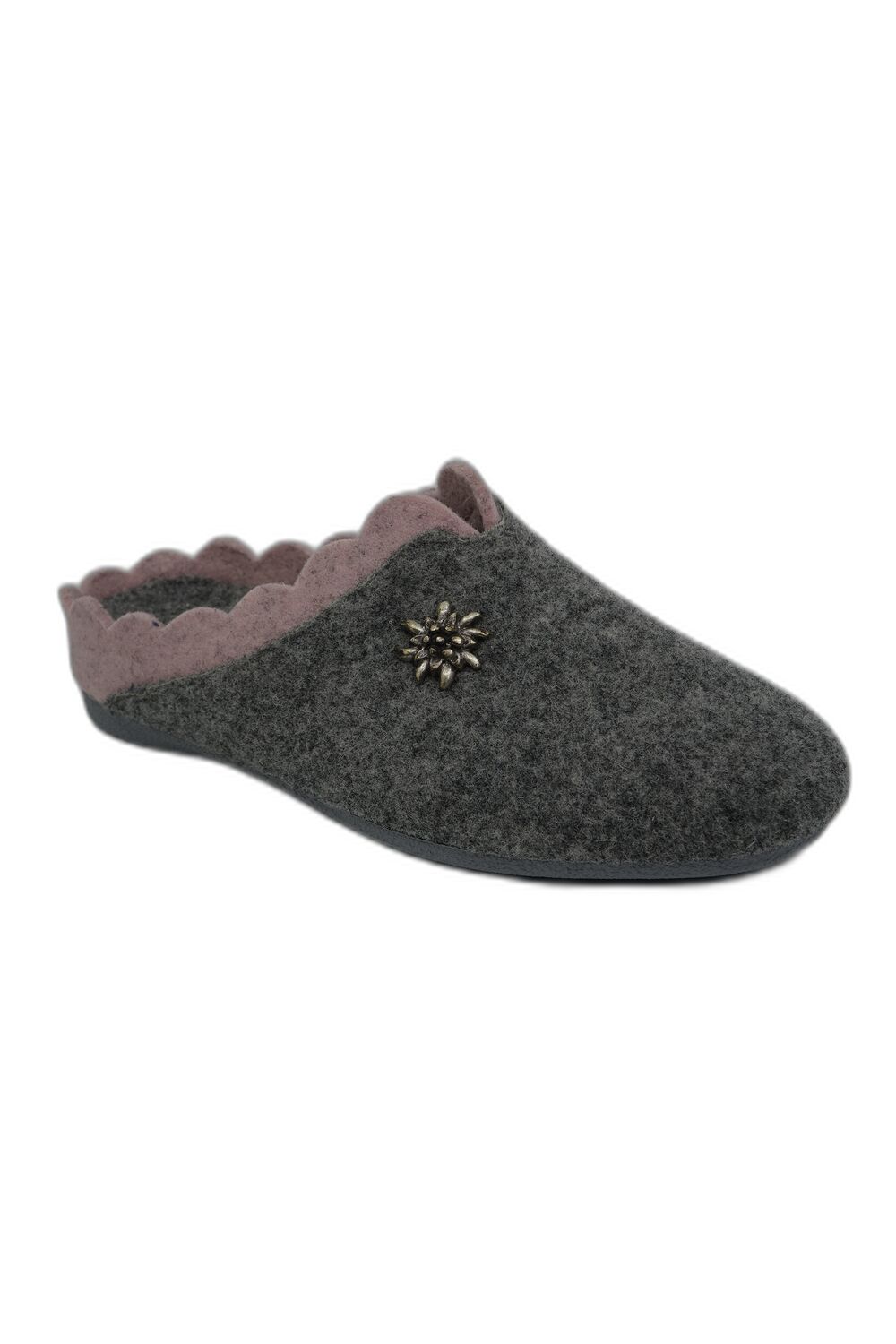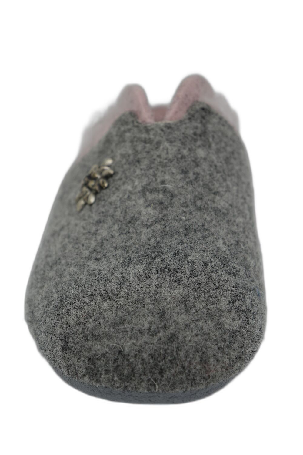 Kapcie GRUNLAND Adri Grigo Cipria GR1798 szary to damskie obuwie domowe wykonane z wysokogatunkowego filcu. Z przodu cholewki znajduje się metalowa broszka, która dodaje atrakcyjności kapciom. Wkładka wykonana jest z pianki pokrytej filcem. Posiada wyprofilowanie podłużne i poprzeczne, które zapewnia prawidłowe ustawienie i odciążenie stopy. Jest możliwość wyjęcia wkładki. Podeszwa wykonana jest z tworzywa, posiada bieżnik antypoślizgowy, który zapewnia dobrą przyczepność do podłoża. W ofercie sklepu mamy też buty na haluksy.