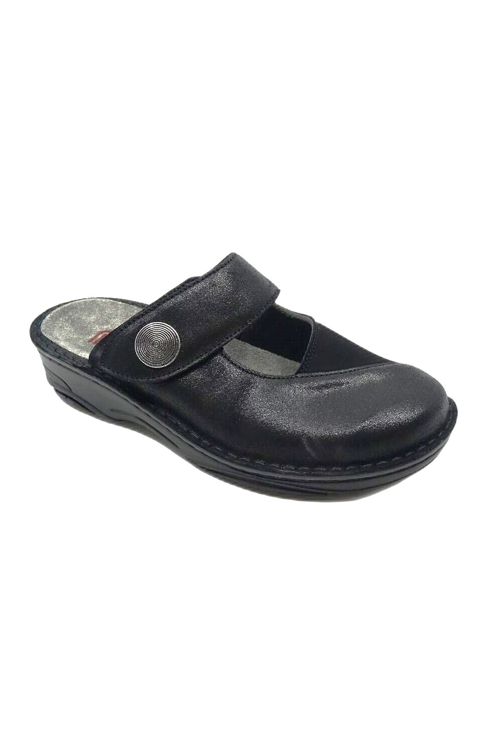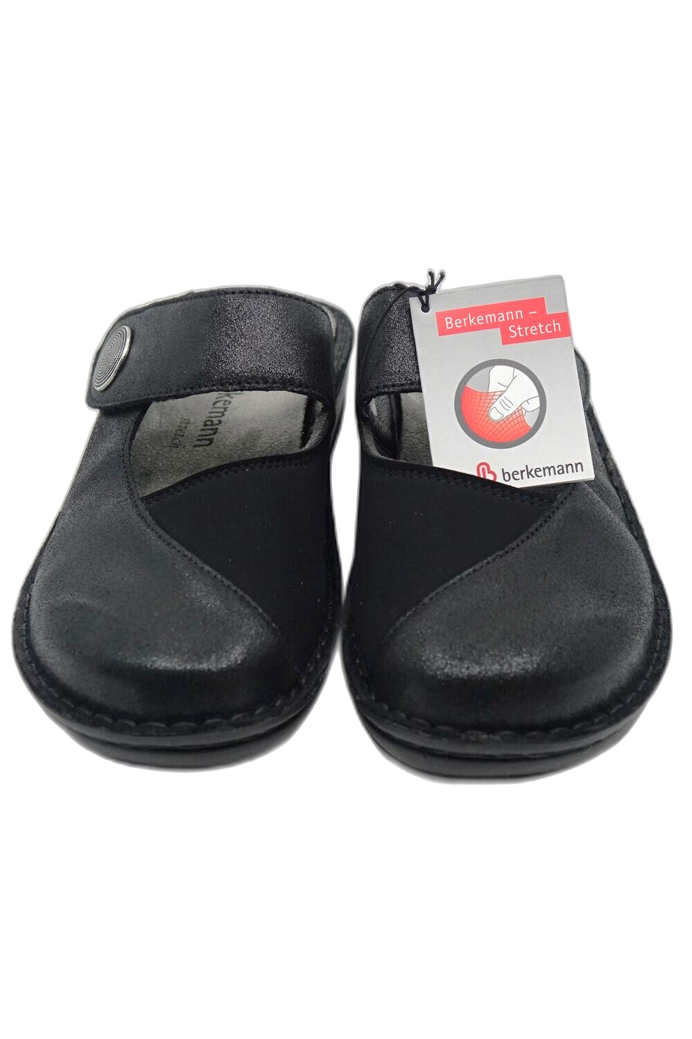 Klapki BERKEMANN Heliane 03457 940 czarny to mega wygodne klapki damskie wykonane z mięciutkiej skóry naturalnej i strechu dzięki, któremu but idealnie dopasowuje się do stopy i zdeformowanych kości palców zapobiegając bólowi i otarciom . Możliwość regulacji tęgości dzięki paskowi zapinanemu na rzep. Wymienna, skórzana wkładka ortopedyczna z wyprofilowaniem na płaskostopie poprzeczne i podłużne zapewnia stopom pełny komfort. Wysokość obcasa 4,5cm. W ofercie mamy też eleganckie buty na szeroką stopę.