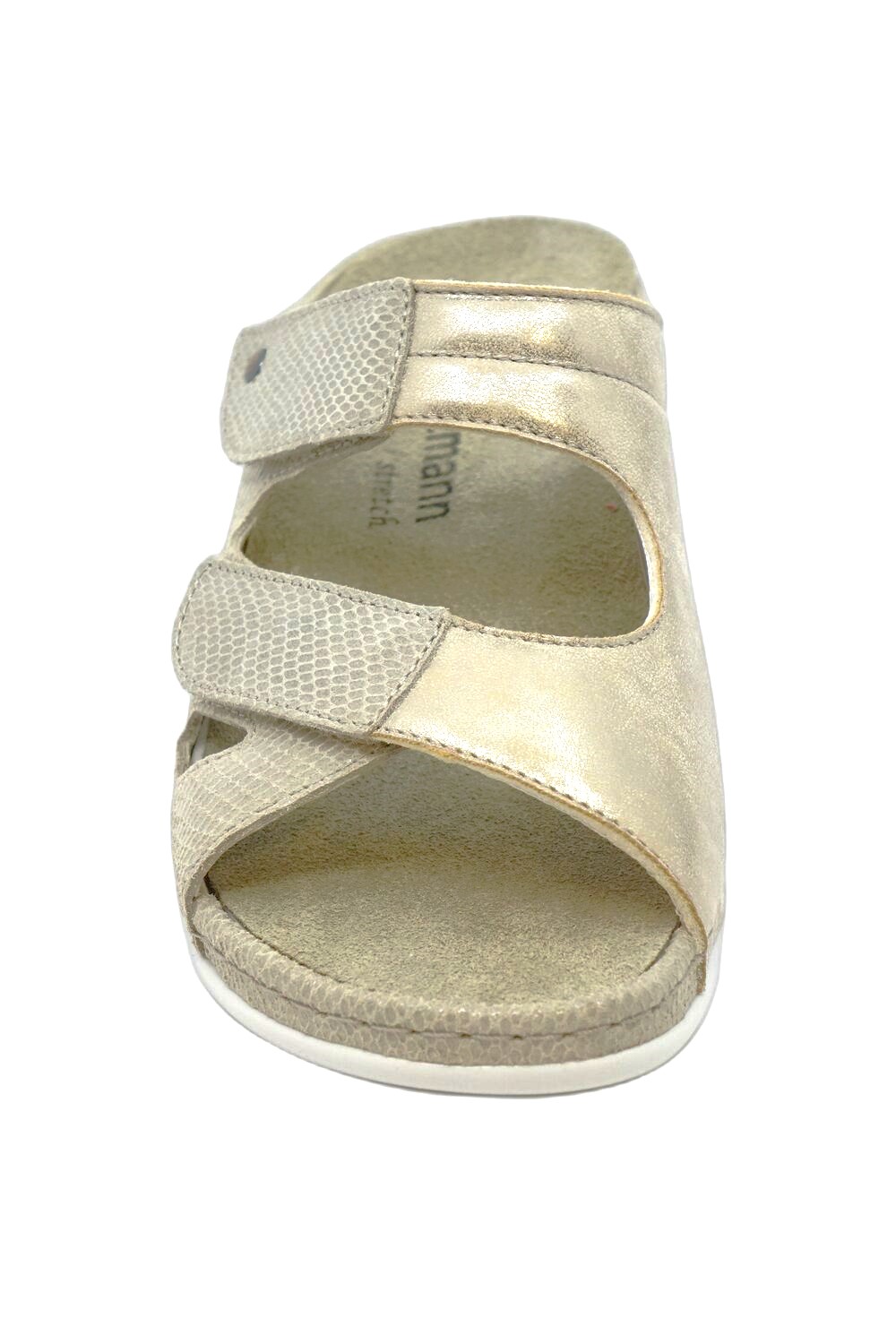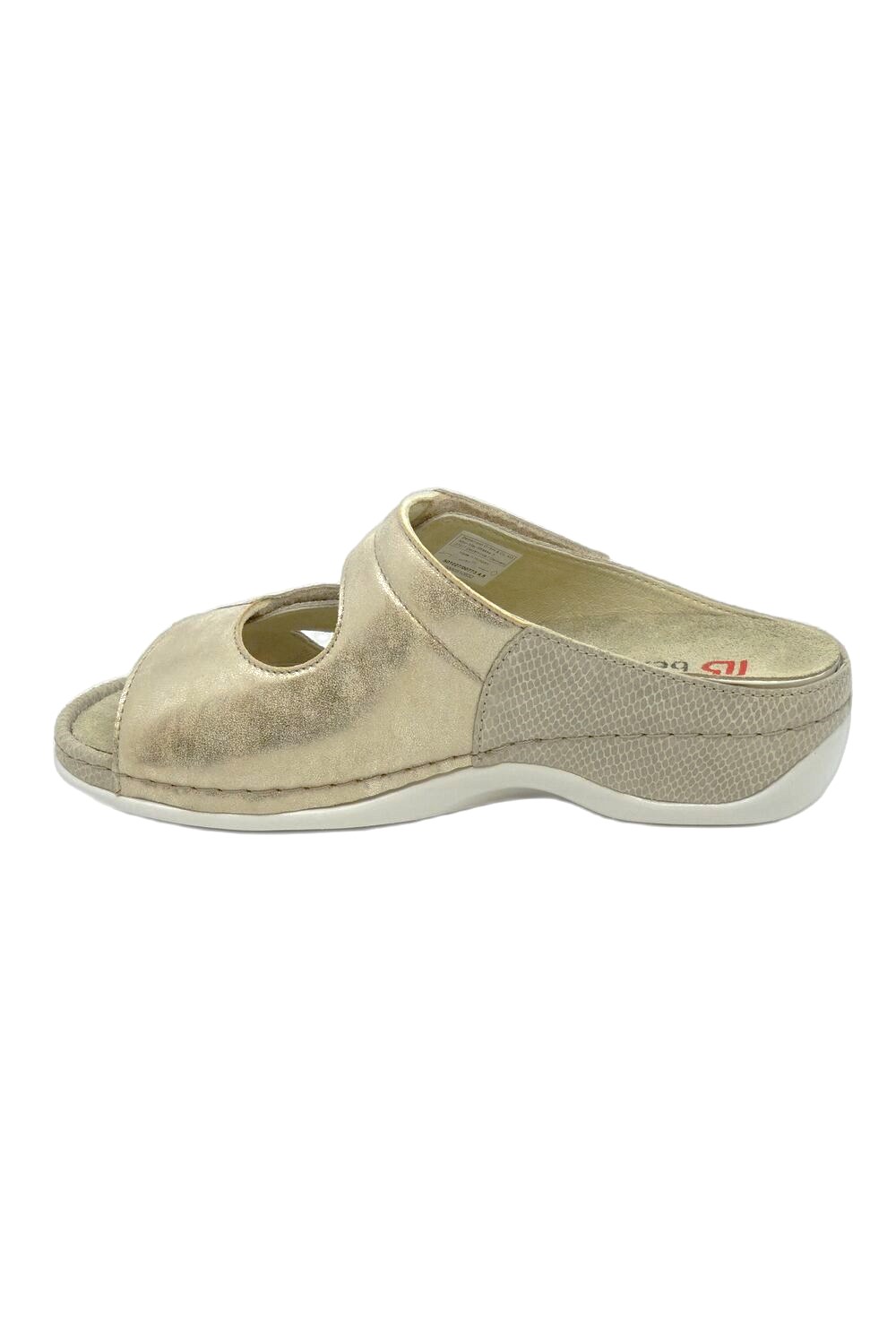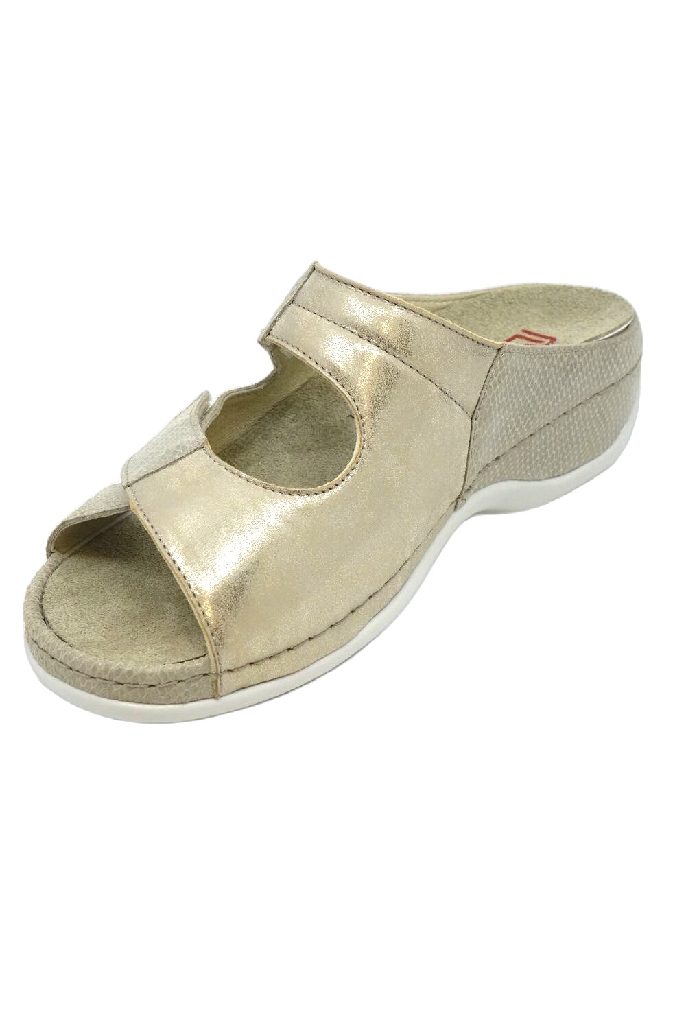 Klapki BERKEMANN Janna 500 01027 773 błszczący beż to klasyczny, ponadczasowy model uwielbiany przez klientki. Wykonany ze skóry naturalnej oraz gąbeczki stretchowej pokrytej skórą licową. Gąbeczka chroni halluxa przed otarciami i odgnieceniami. Wyprofilowana, wymienna, skórzana wkładka przynosi ulgę zmęczonym i obolałym stopom. Amortyzacja w tylnej części podeszwy odciąża kręgosłup zwiększając komfort użytkowania. Tęgość regulowana H +. Długa podwójna regulacja na rzepy pozwala dopasować obuwie nawet do szerokiej, zdeformowanej stopy. W ofercie posiadamy też buty damskie na haluksy.