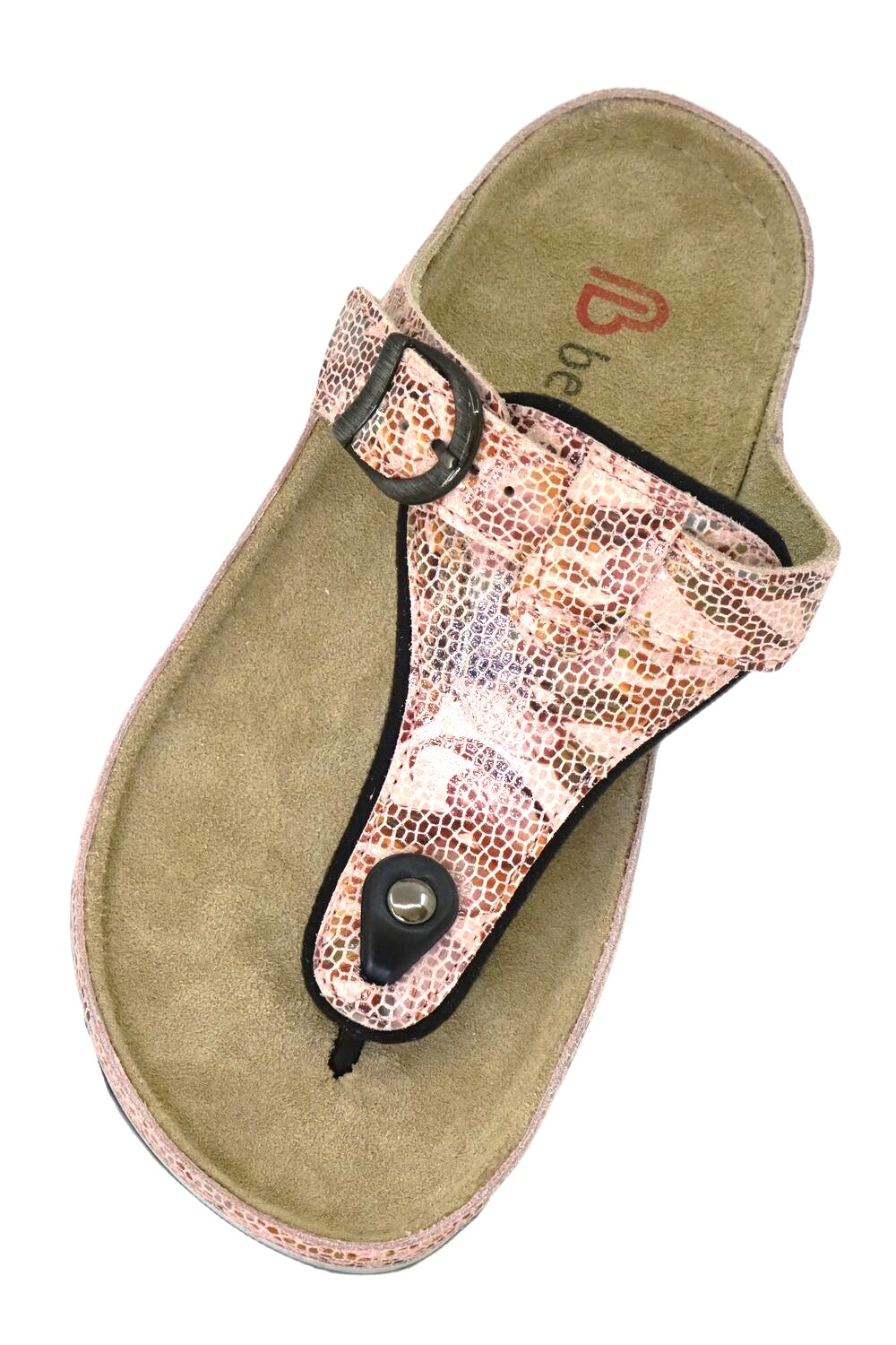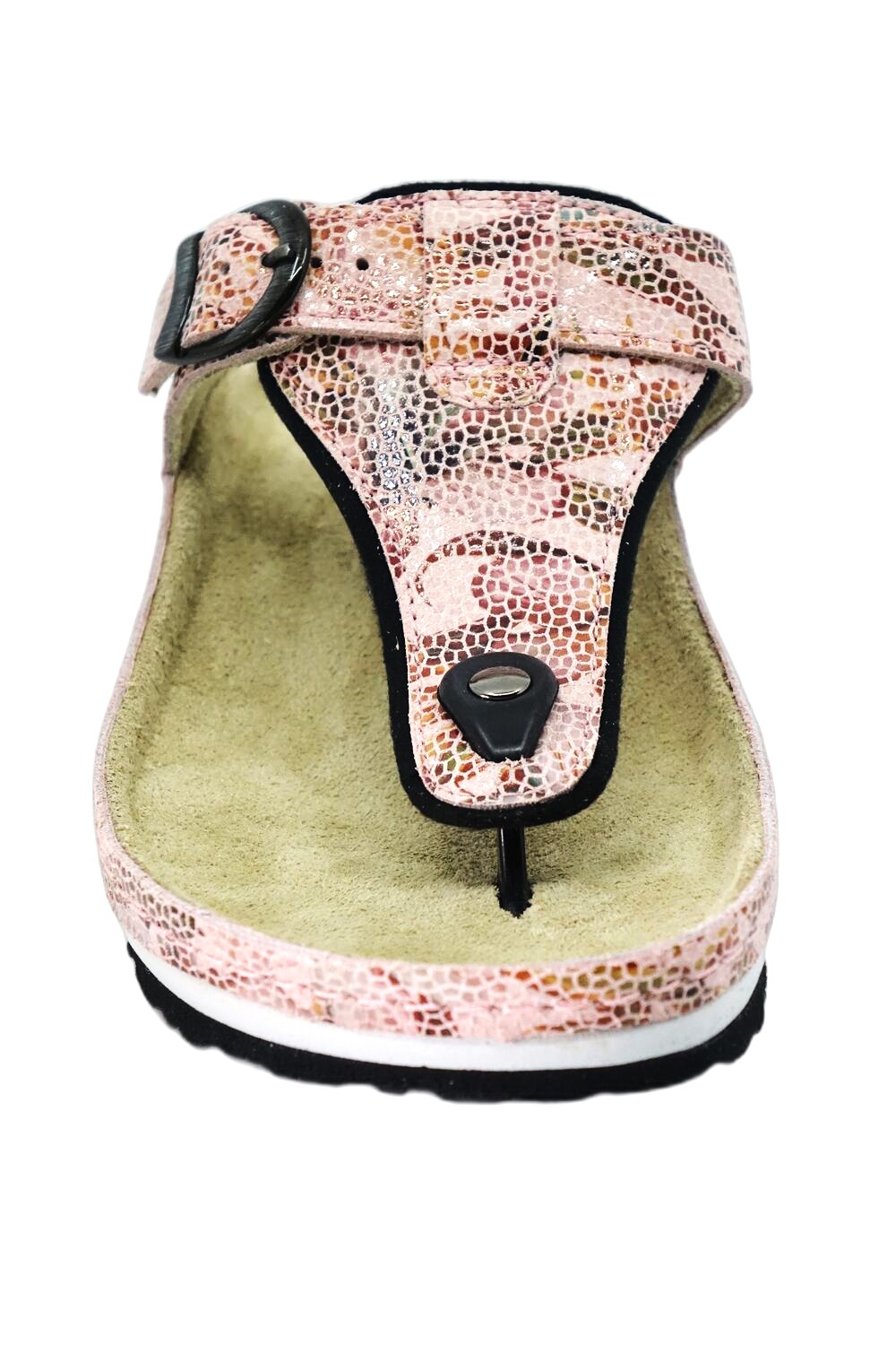 Klapki BERKEMANN Mila (japonki)500 01351 20 różowy to letnie obuwie w typie japonek ze skóry nubukowej. Piękny wakacyjny wzór typu boa dodaje butom ciekawego wyglądu. Regulacja podbicia za pomocą sprzączki. Skórzana wyprofilowana wkładka podpiera łuki stopy, odciąża kręgosłup i przynosi ulgę zmęczonej stopie. Posiada wałek podpierający palce. Korytkowa budowa zapewnia stopie prawidłowe ułożenie. Podeszwa szeroka wykonana z tworzywa wysokiej jakości. W ofercie mamy też eleganckie buty na haluksy.