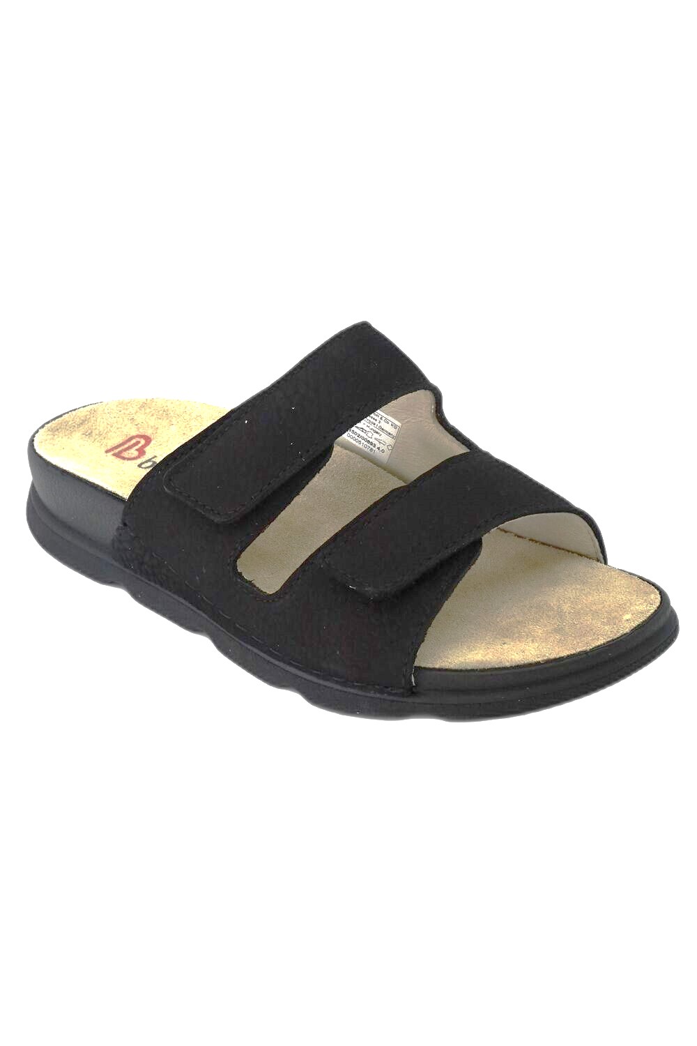 Klapki BERKEMAN N Sabatina 04502-893 czarny to klasyczny wygodny but damski wykonany ze skóry licowej. Dwa paski zapinane na rzep pozwalają wyregulować tęgość i dopasować dobrze buta do nogi. Wkładka skórzana, wyprofilowana na płaskostopie poprzeczne i podłużne z możliwością wyjęcia i zastąpienia wkładką indywidualną. Jest również możliwość dokupienia wkładki oryginalnej na wymianę. Podeszwa płaska, elastyczna wykonana jest z tworzywa poliuretanowego. W podeszwie zastosowano amortyzator odciążający piętę. . W ofercie mamy też buty na opuchnięte stopy..