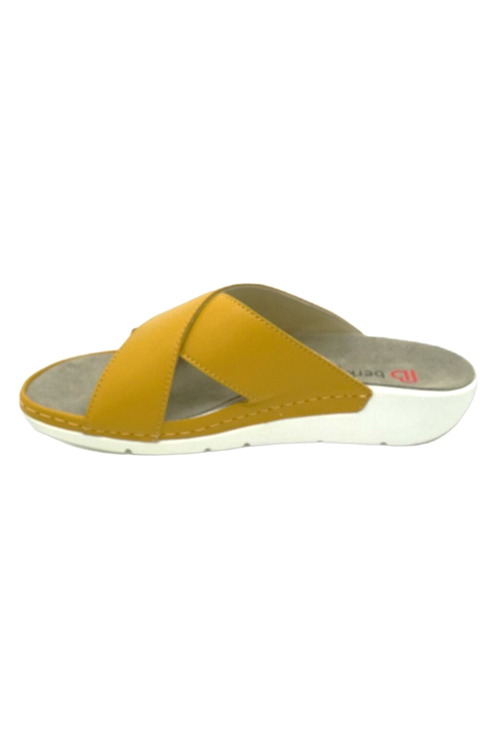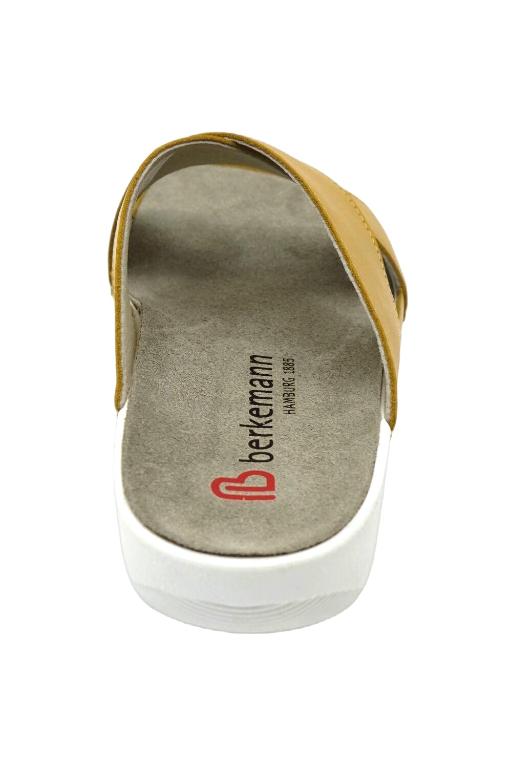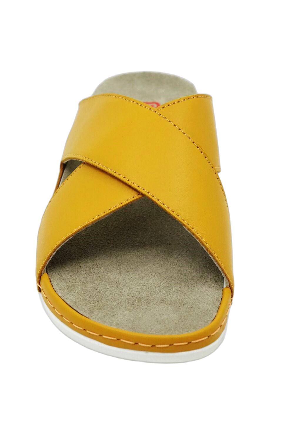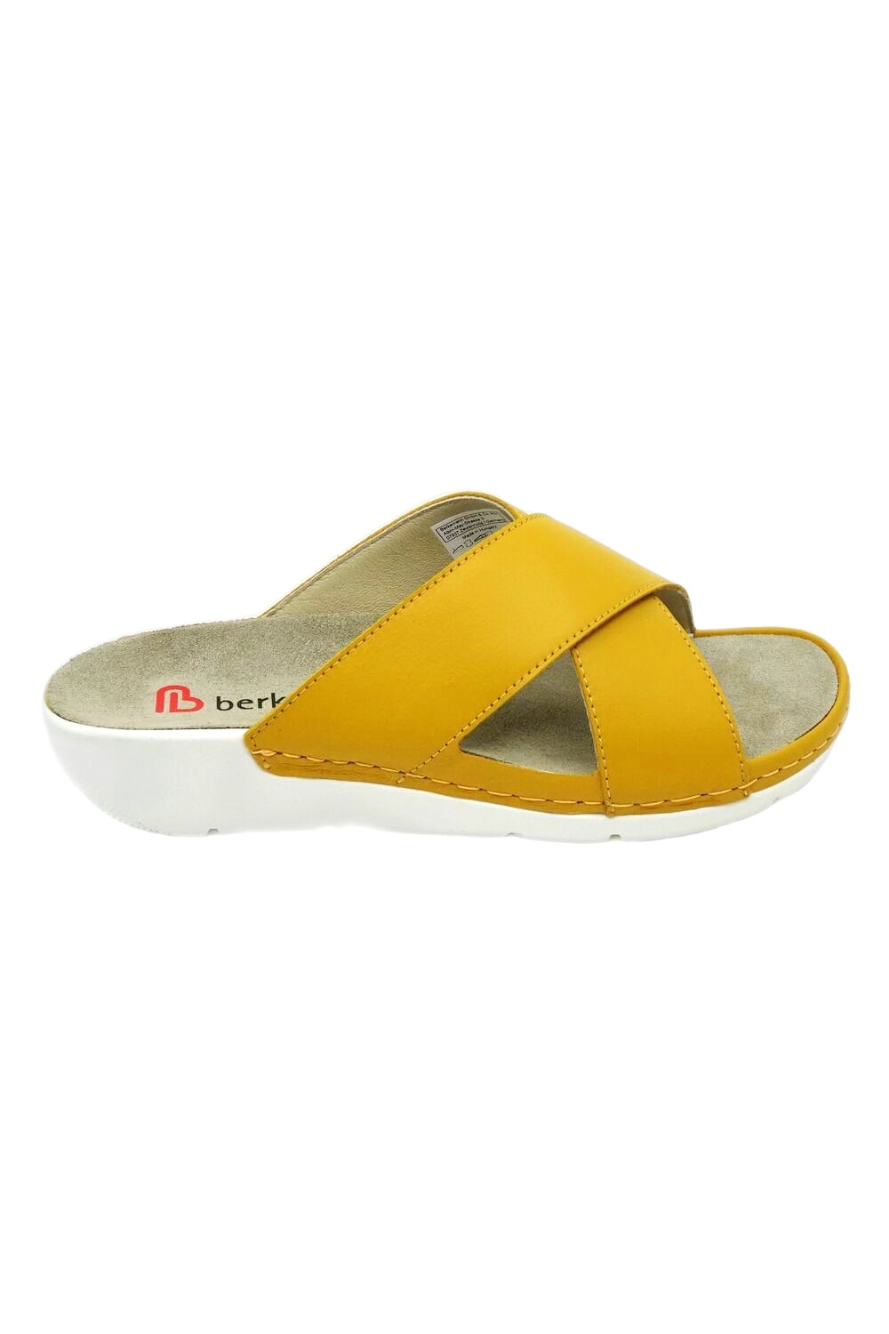Klapki BERKEMANN Vania 01465 501 żółty to stylowe damskie obuwie na sezon letni. Wykonane zostało w całości ze skóry licowej. Brak możliwości regulacji tęgości. Dwa skrzyżowane paski pozwalają na dopasowanie klapek do podbicia. Wyjmowana, skórzana, wyprofilowana wkładka odciąży stopę, podeprze jej naturalne łuki (podłużny i poprzeczny) a także przyniesie ulgę obolałym i zmęczonym stopom. Grubsza podeszwa odizoluje stopę od nierównego podłoża i zamortyzuje mikrowstrząsy powstałe w wyniku chodzenia. Całkowita wysokość obcasa wynosi 4 cm. W ofercie mamy też buty na wysokie podbicie.
