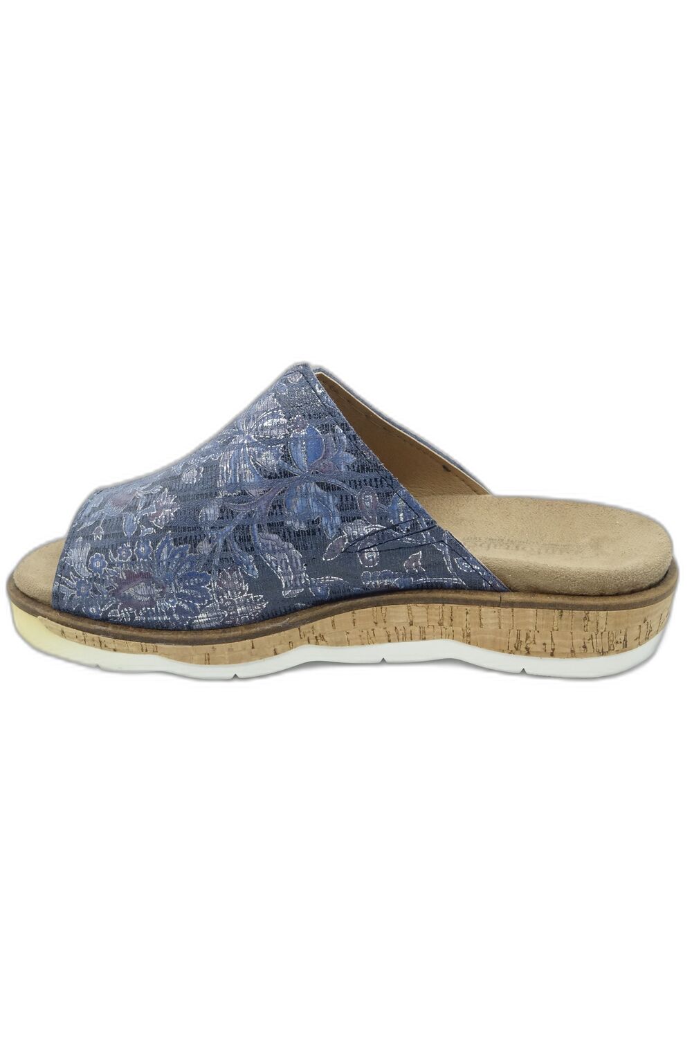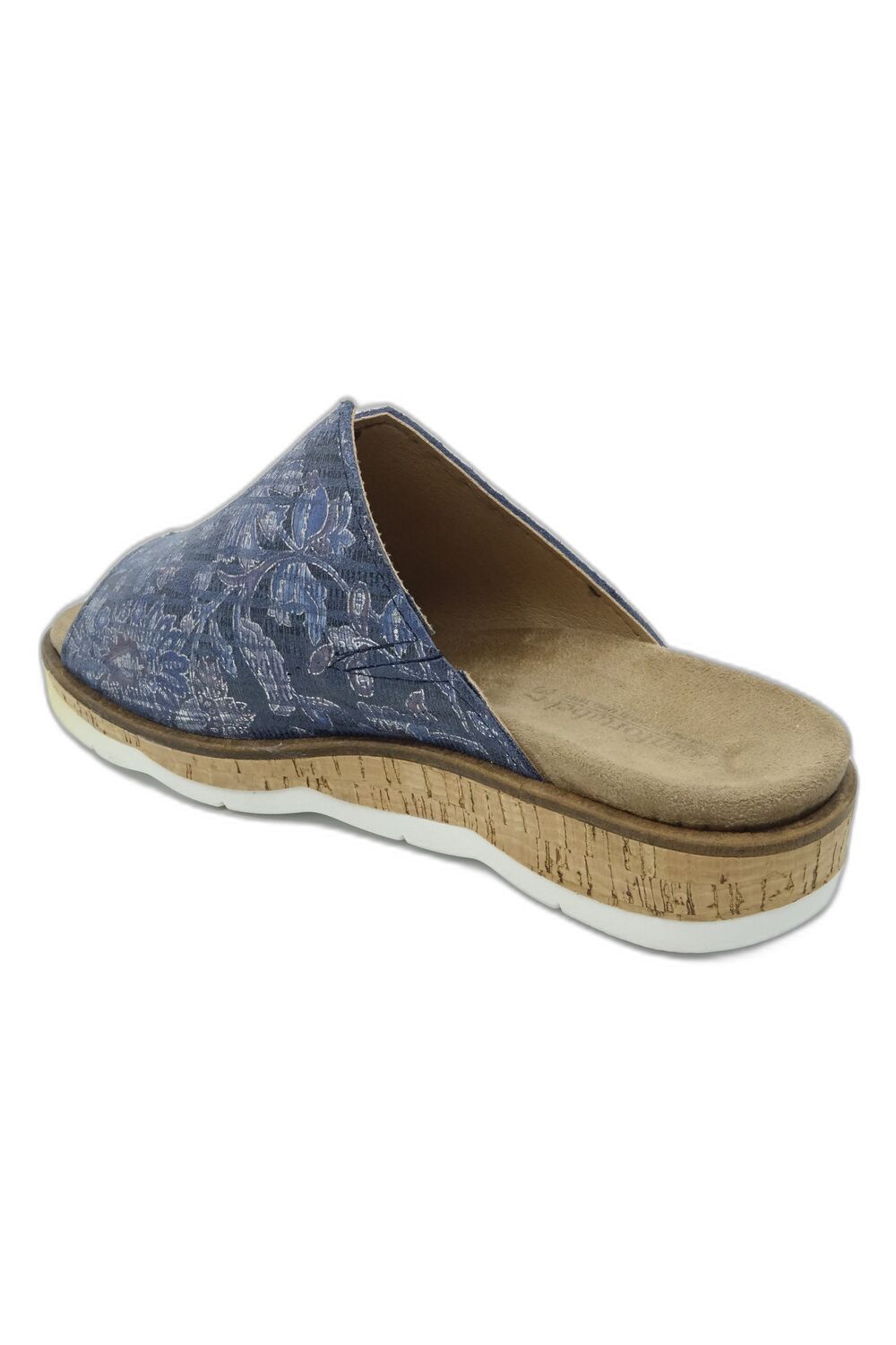 Klapki COMFORTABEL 700415-05 granatowy to letnie eleganckie buty wykonane ze skóry nubukowej. Cholewkę stanowi szeroki pasek trzymający stopę na podbiciu. Kwiatowy wzór nadaje obuwiu delikatności i finezji. Wkładka wykonana z materiału oddychającego. Profil odciąża kręgosłup oraz przynosi ulgę zmęczonej stopie. W razie potrzeby, wkładkę możemy z łatwością wyciągnąć z buta do czyszczenia lub podmiany na inną. Podeszwa wykonana jest z wysokogatunkowego tworzywa. W ofercie mamy też sandały na szeroką stopę.