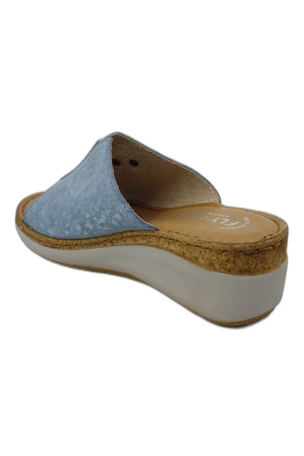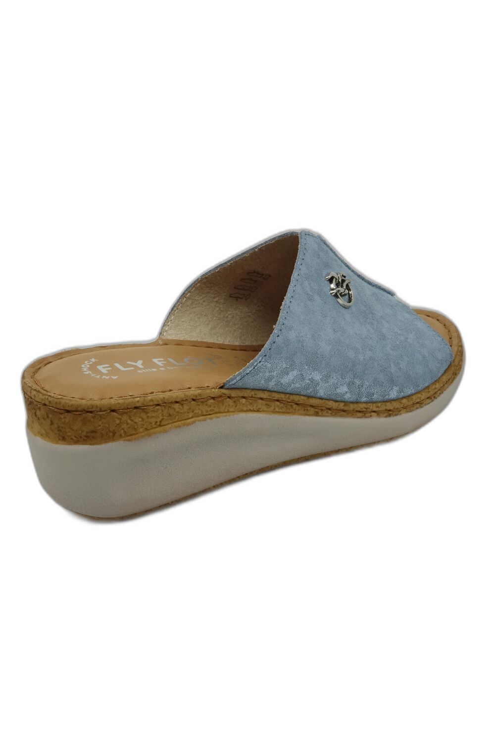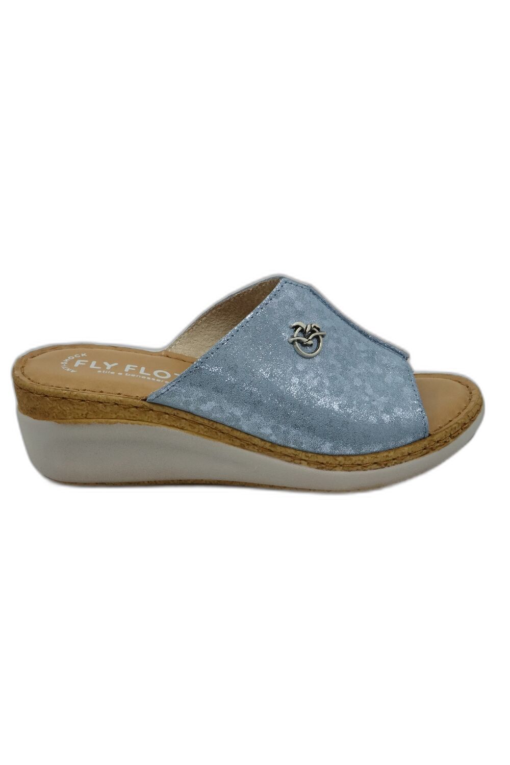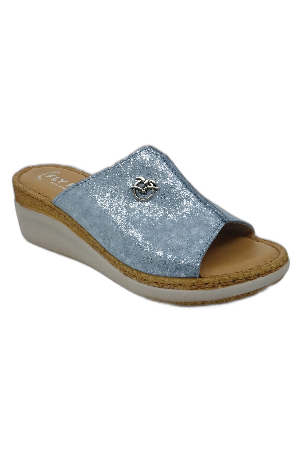 Klapki FLY FLOT 36H68 5G niebieski to damski but łączący w sobie elegancję z wygodą. Cholewkę stanowi szeroki pasek wykonany ze skóry. Błyszczący nadruk i broszka nadają klapkom urokliwego wyglądu. Od spodu pasek podszyty jest miękkim materiałem. Wkładka wykonana jest z miękkiej pianki pokrytej od góry skórą naturalną. Wkładka jest bardzo miękka, amortyzuje wstrząsy, odciąża stopę, dając uczucie „stąpania po puchu „. Podeszwa z koturnem wykonana jest tworzywa, niweluje nierówności terenu i wraz z wkładką amortyzuje mikrowstrząsy.