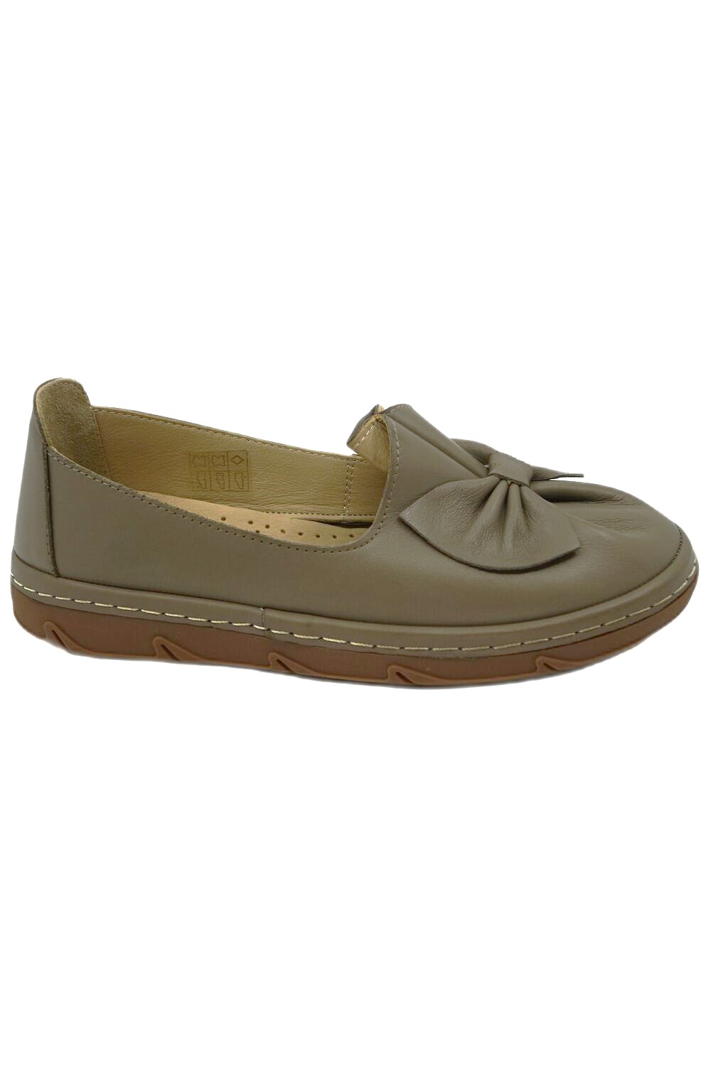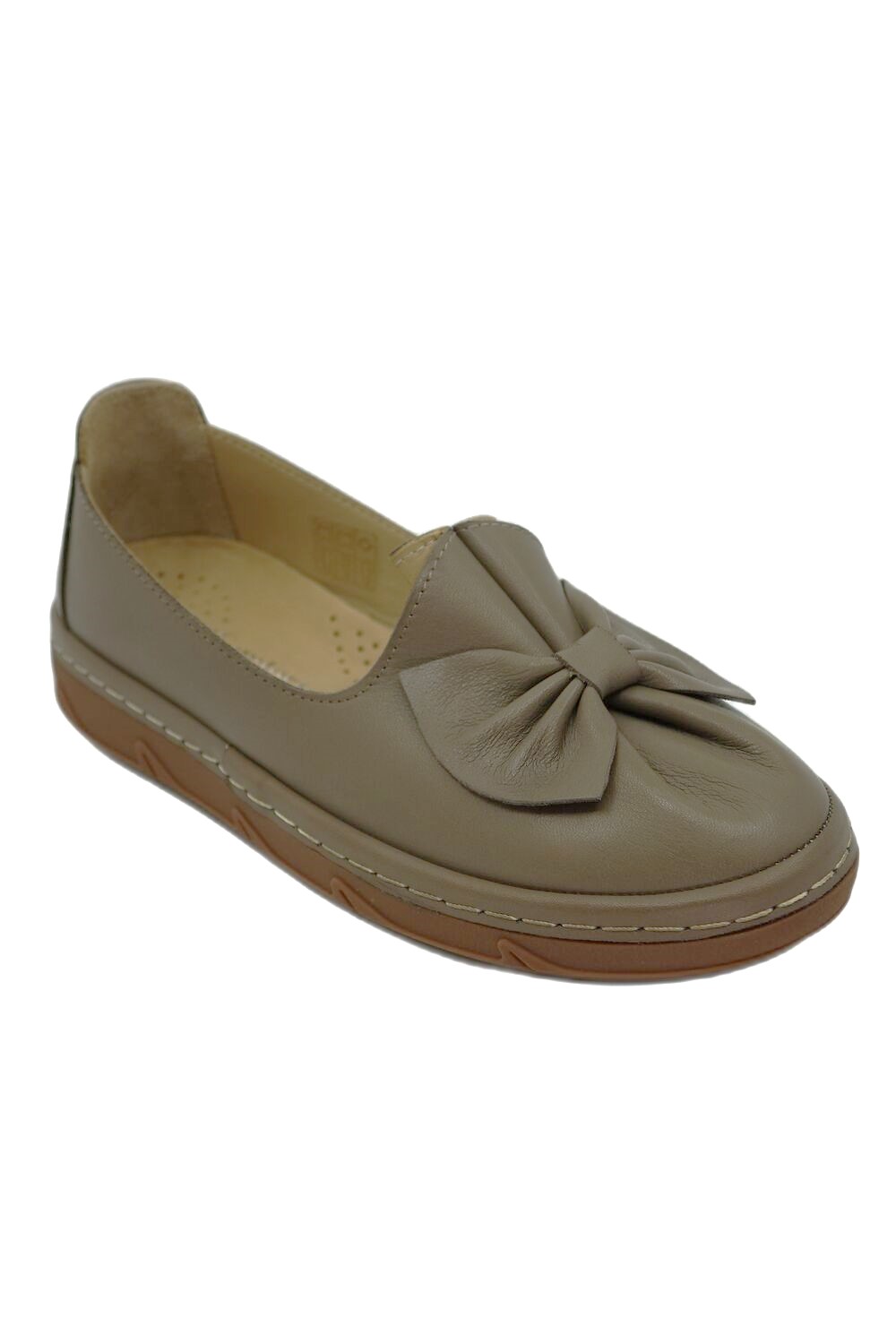 Półbuty COMFORTABEL 940401-08 beżowy to modne, wygodne wsuwane półbuty damskie wykonane z wysokiej jakości skóry naturalnej. Marszczone z przodu cholewki z kokardką jest elementem ozdobnym. Wkładka wykonana z miękkiej skóry posiada delikatne wyprofilowanie podpierające łuk podłużny stopy. Dzięki perforacji wkładki zapewniona jest cyrkulacja powietrza i stopa oddycha. Buty te sprawdzą się przy bólu pięty i ostrodze piętowej. Płaska podeszwa wykonana jest z tworzywa, posiada bieżnik antypoślizgowy zapewniający dobrą przyczepność do podłoża. W ofercie sklepu mamy też buty damskie na haluksy.