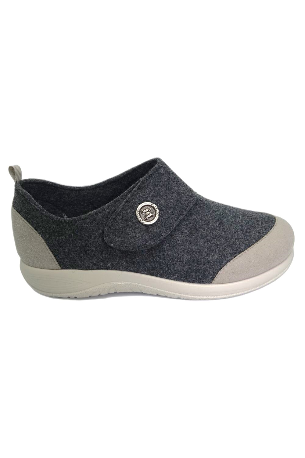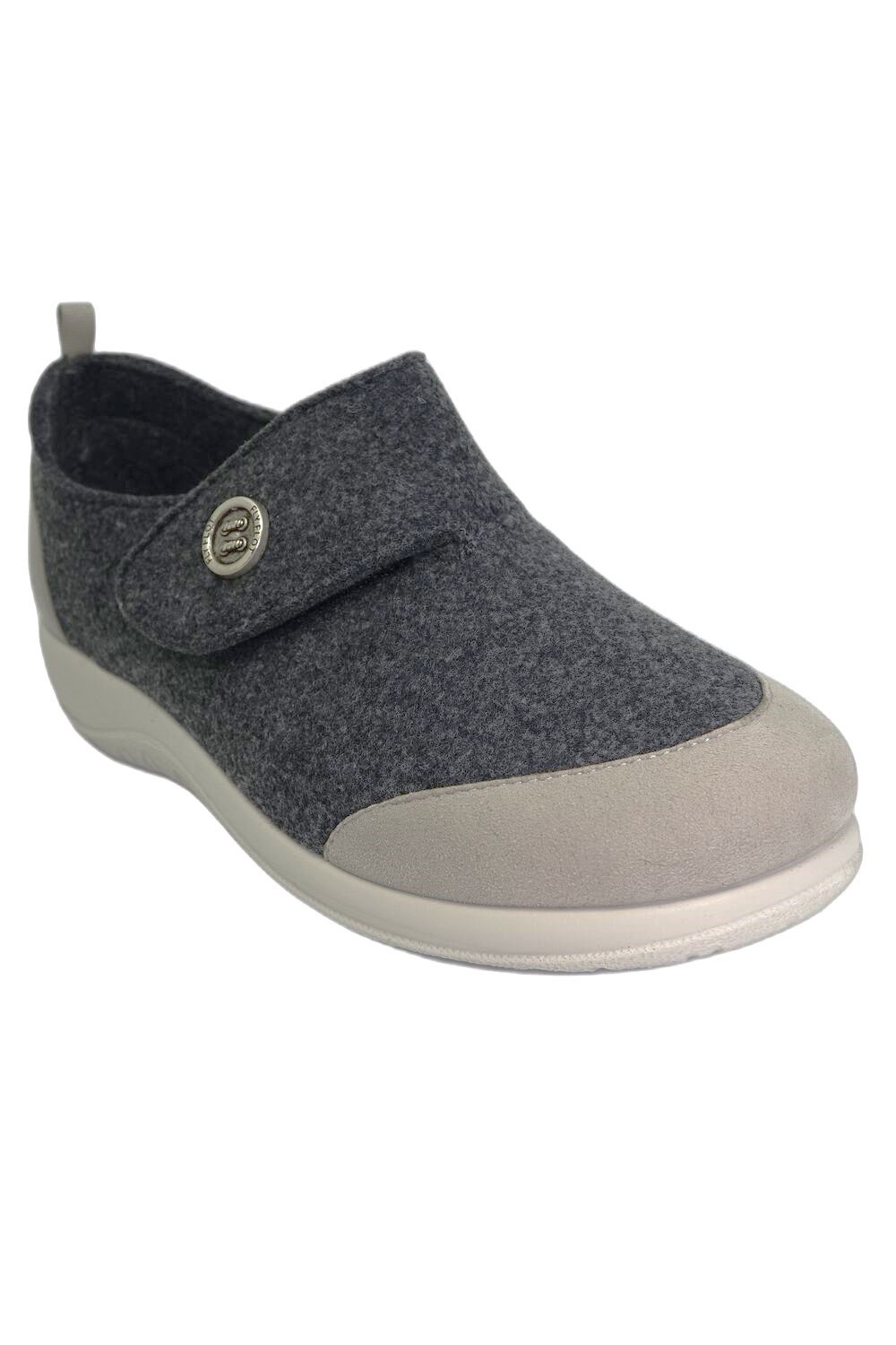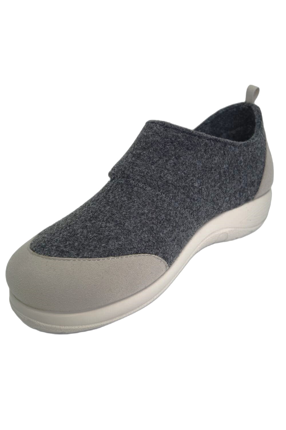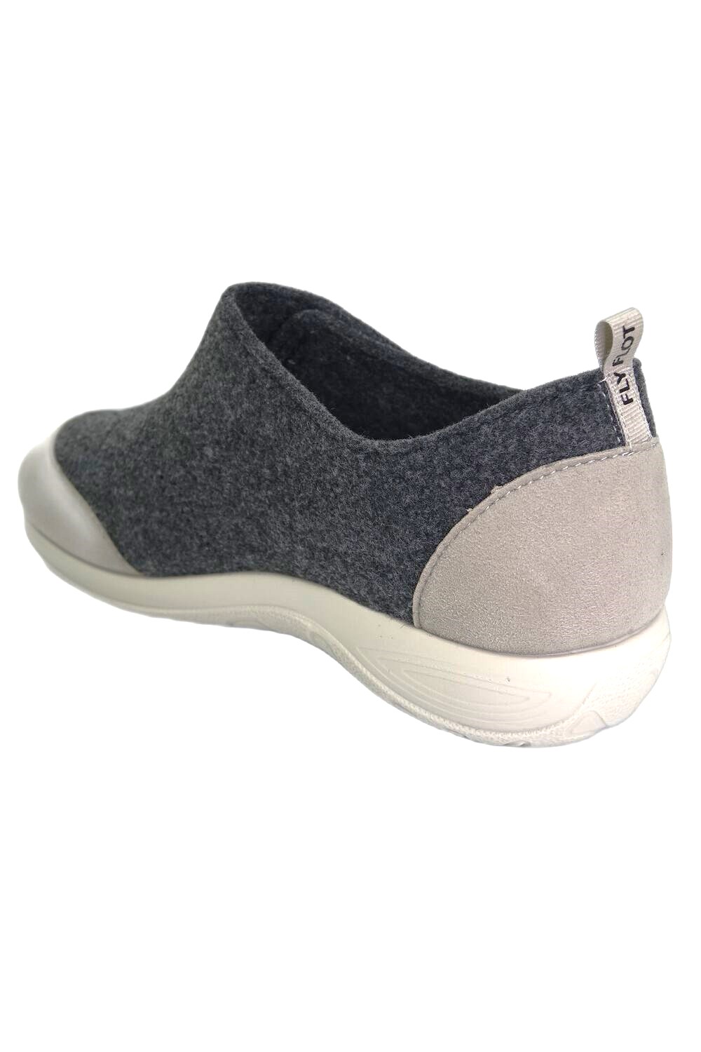 Półbuty FLY FLOT P5 U12 F8 szary to wygone, szerokie obuwie damskie o szerokim zastosowaniu zarówno jako but domowy, jak i jako but wyjściowy. Półbuty wykonane są z miękkiego filcu, dzięki temu dopasowują się do stopy nie powodując otarć. Sprawdzą sie przy haluksach, palcach młotkowatych, a także stopie cukrzycowej. Pasek zapinany na rzep pozwala na wyregulowanie tęgości na podbiciu. Miękka wkładka wykonana jest z pianki pokrytej materiałem, odciąża stopę, zapewnia stopię amortyzację i komfort podczas chodzenia. Wkładkę możn wyjąć i w razie potrzeby zastąpić wkładką indywidualną. Wkładka sprawdzi się przy bolącej pięcie i ostrodze piętowej. Lekka, elastyczna podeszwa wykonana jest z tworzywa, posiada bieżnik antypoślizgowy, dzięki temu ma dobrą przyczepność do podłoża. W odercie mamy też eleganckie buty na szeroką stopę.