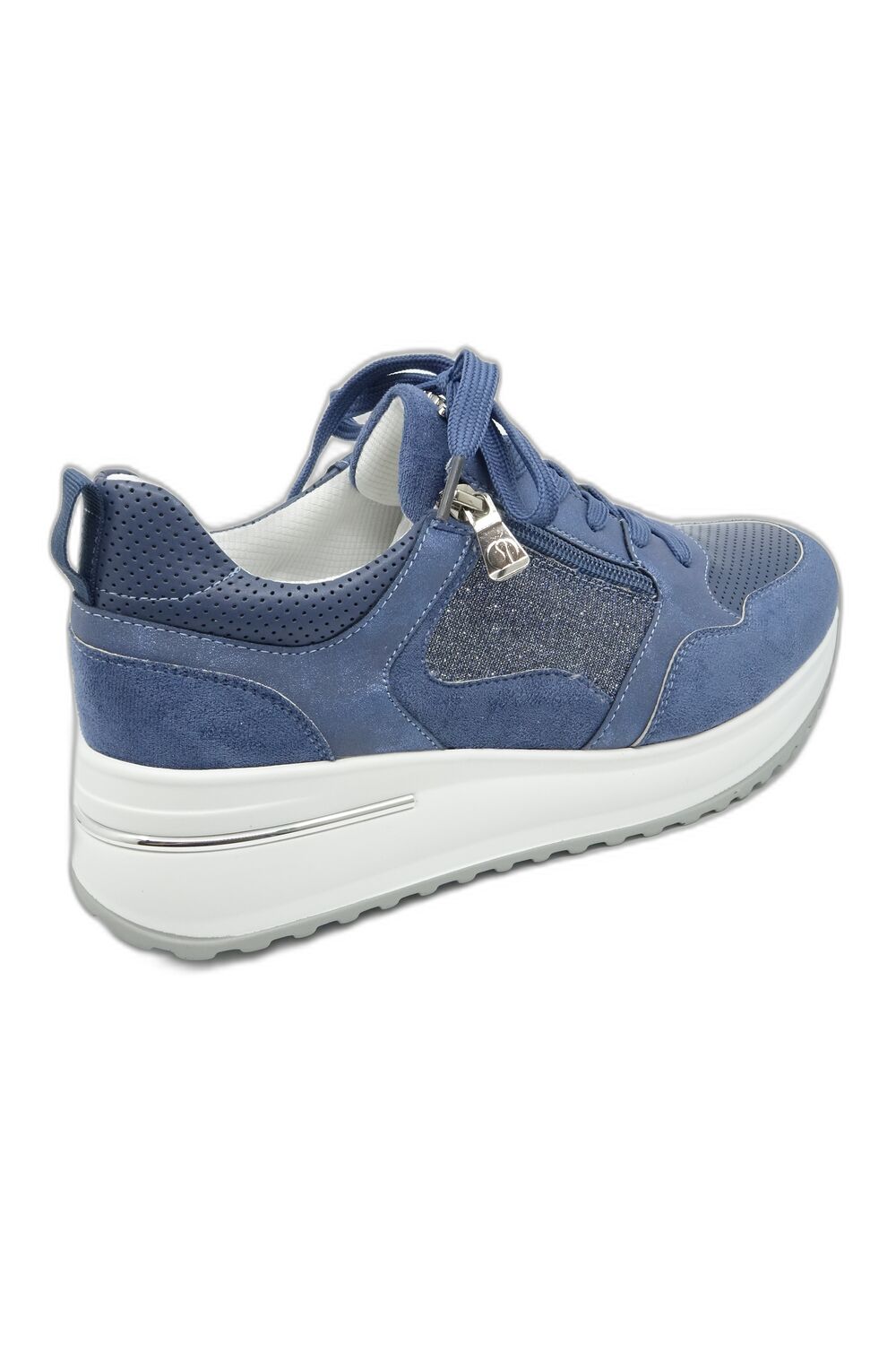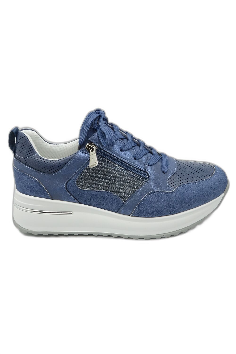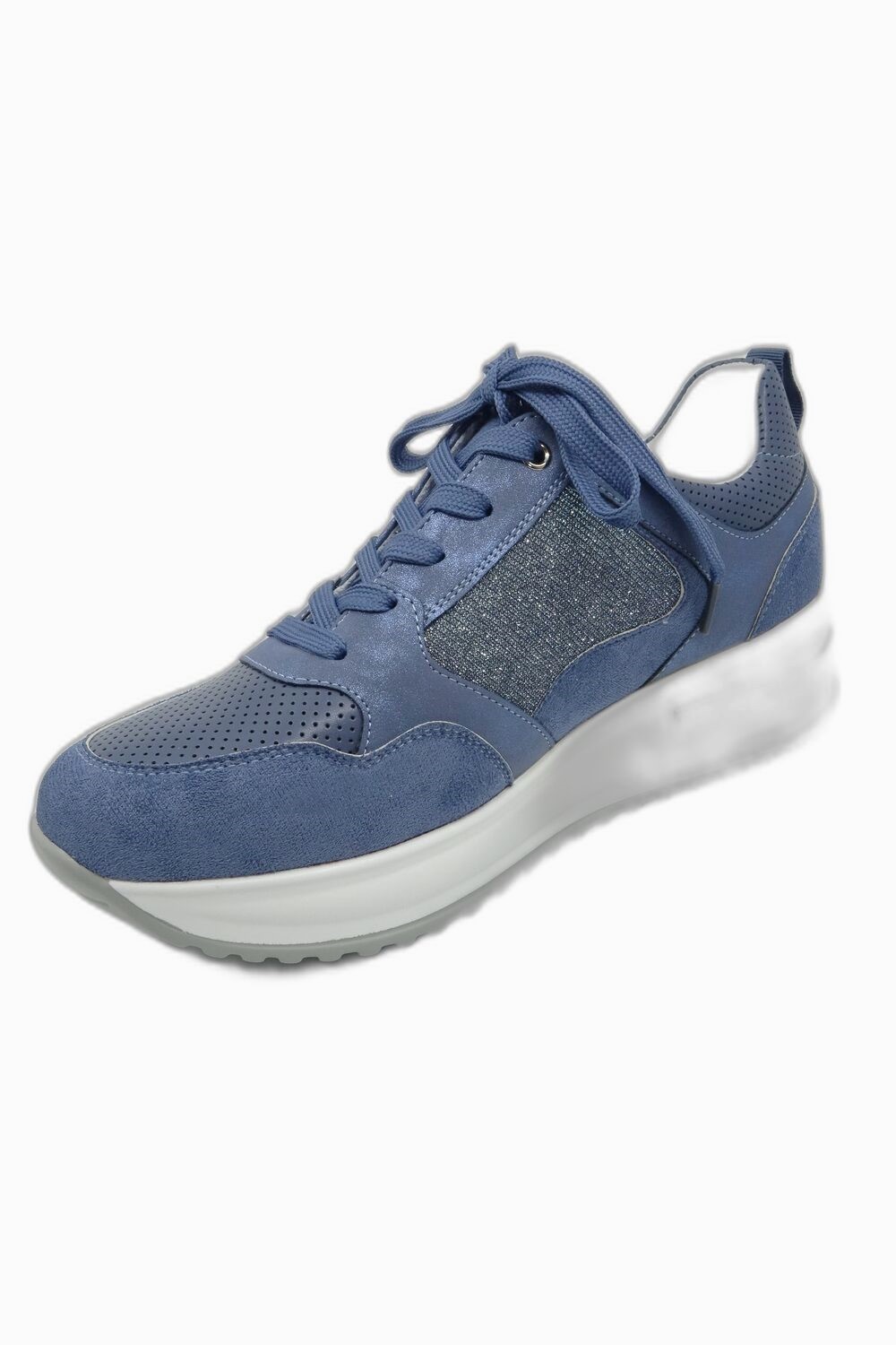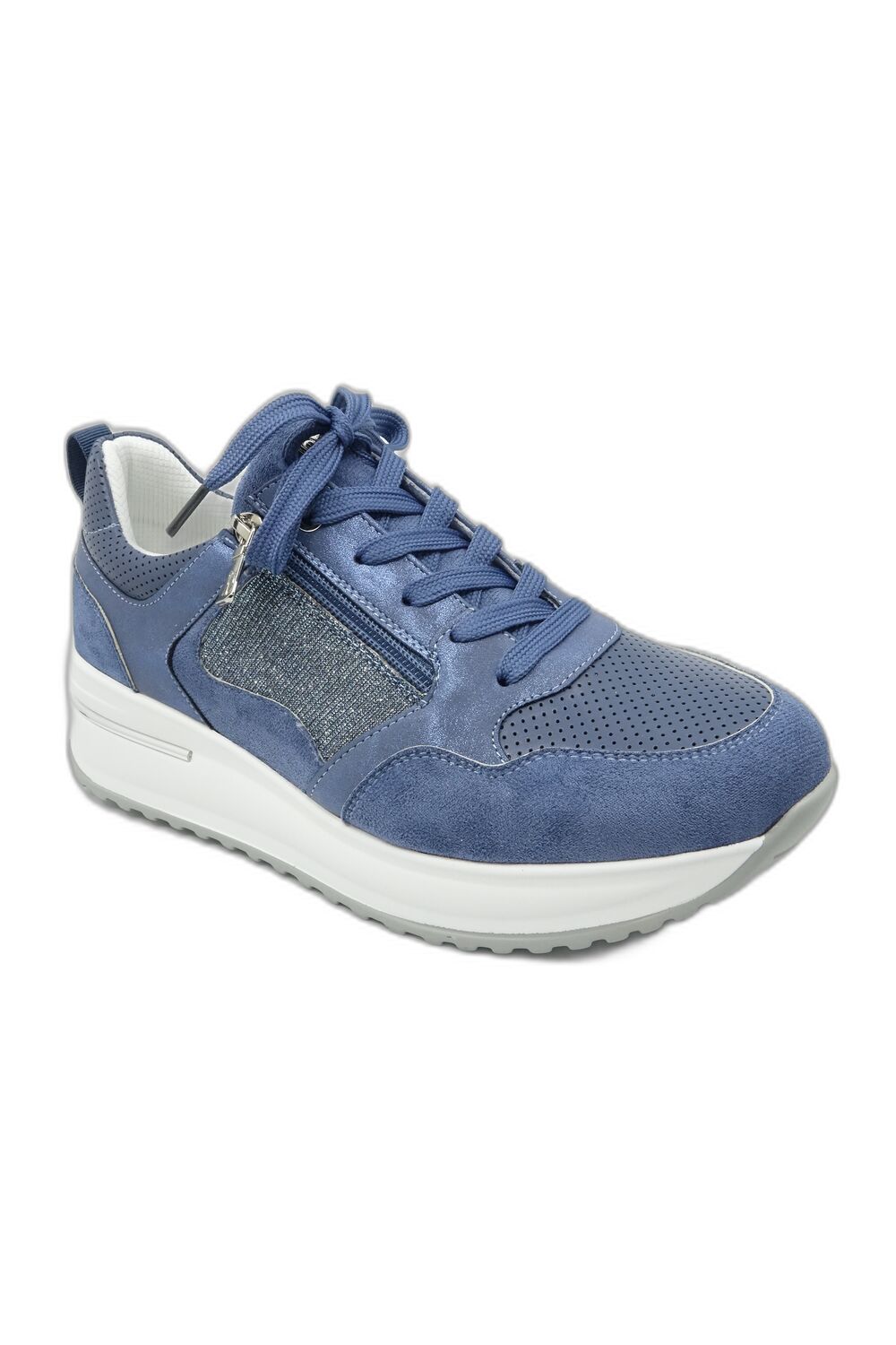 Półbuty INBLU IN000420 niebieski to wygodny i modny fason buta damskiego w sportowym stylu wykonany z eco skóry i tworzywa. Przód cholewki sznurowany, pozwala to na regulację tęgości i dopasowanie buta do stopy. Z boku cholewki wszyty jest suwak, ułatwia on zakładanie obuwia. Przednia część cholewki jest perforowana, co zapewnia cyrkulację powietrza w bucie. Dzięki błyszczącym brokatowym wstawkom z tworzywa półbut nabiera ciekawego wyglądu. Wnętrze buta wyściełane jest materiałem. Wyjmowana wkładka wykonana jest z pianki pokrytej materiałem. Pianka ma za zadanie amortyzować i odciążać stopę zapewniając jej komfort podas chodzenia. Lekka, biała podeszwa typu platforma wykonana jest z tworzywa . Dzięki swej budowie niweluje nierówności terenu i wraz z wkładką zapewnia stopie amortyzację mikrowstrząsów.