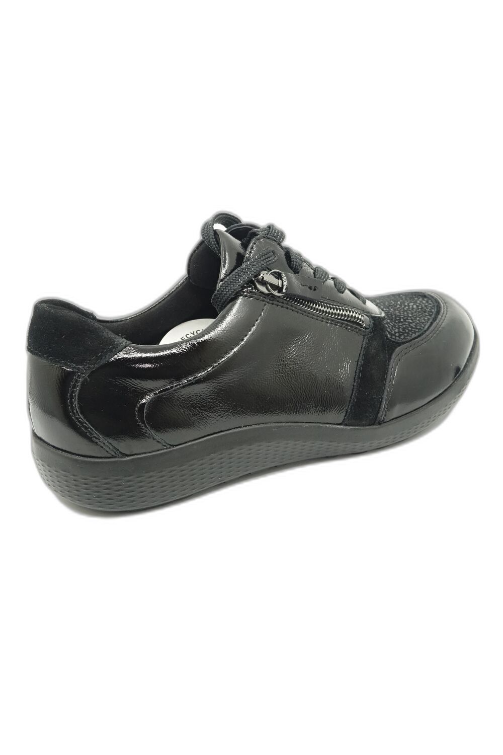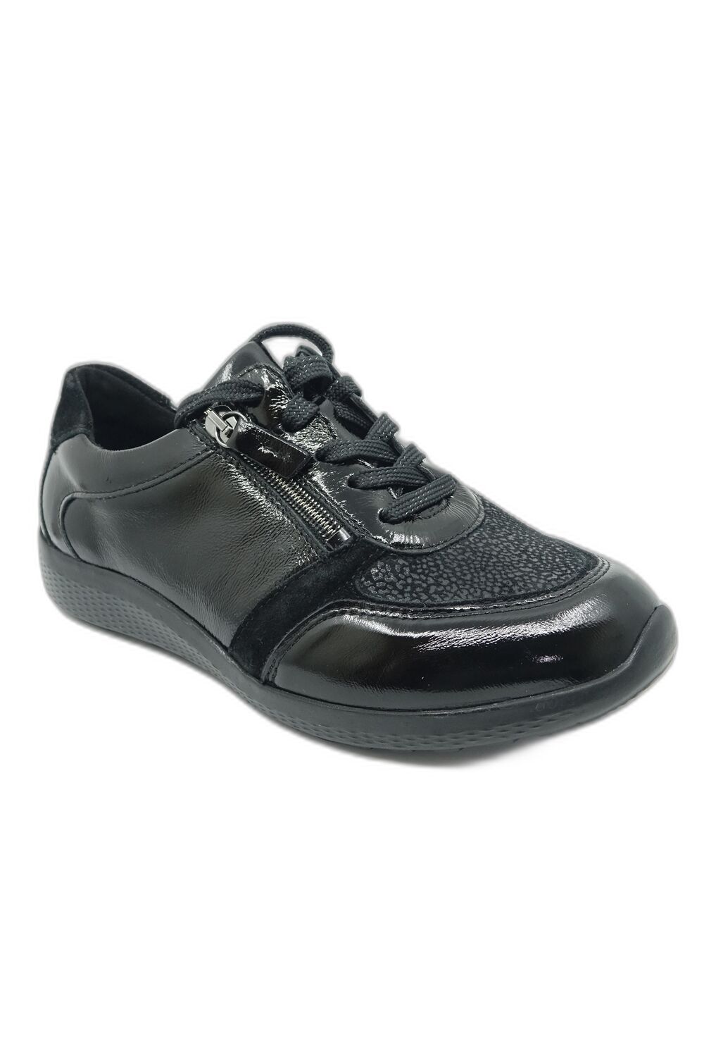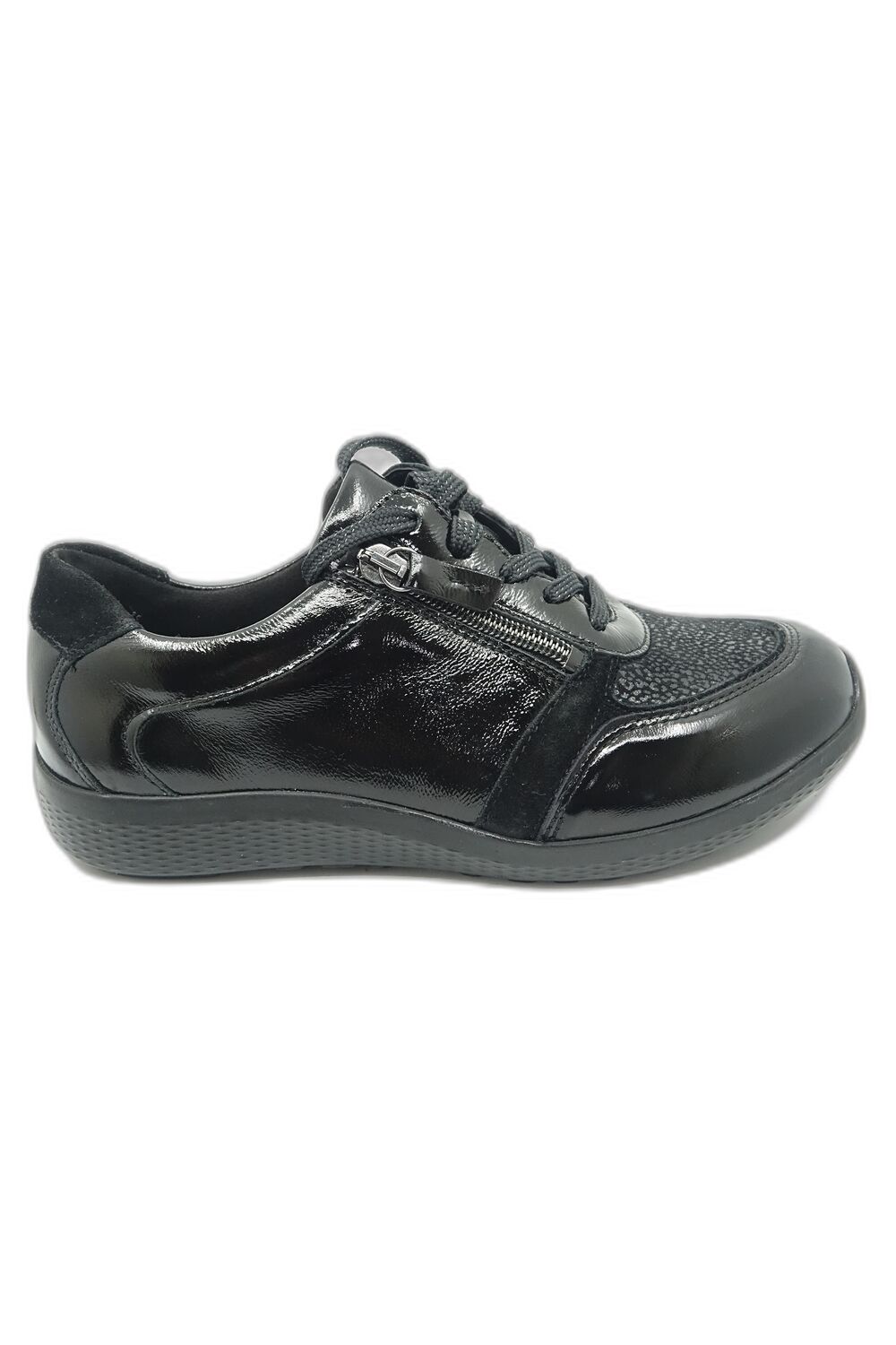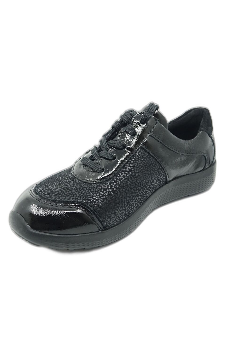 Półbuty WALDLAUFER Ira 815M01411001 czarny to wygodne buty w stylu sportowym. Wierzch wykonany ze skóry licowej lakierowanej i stretchu (w miejscu halluksów). Regulacja tęgości i dopasowanie do stopy poprzez sznurowanie . Łatwość wkładania dzięki suwakom po bokach. Wkładki wyjmowane, wykonane są z miękkiej pianki typu soft pokrytej mikrofibrą. Posiadają anatomiczny profil poprzeczno podłużny, podpierają łuki w stopie i zapewniają komfort chodzenia. Lekka podeszwa wykonana jest z tworzywa PU, posiada dobrą przyczpność do podłoża. Wysoka elastyczność buta zapewnia komfort stopom wrażliwym skłonnym do otarć i nacisków.