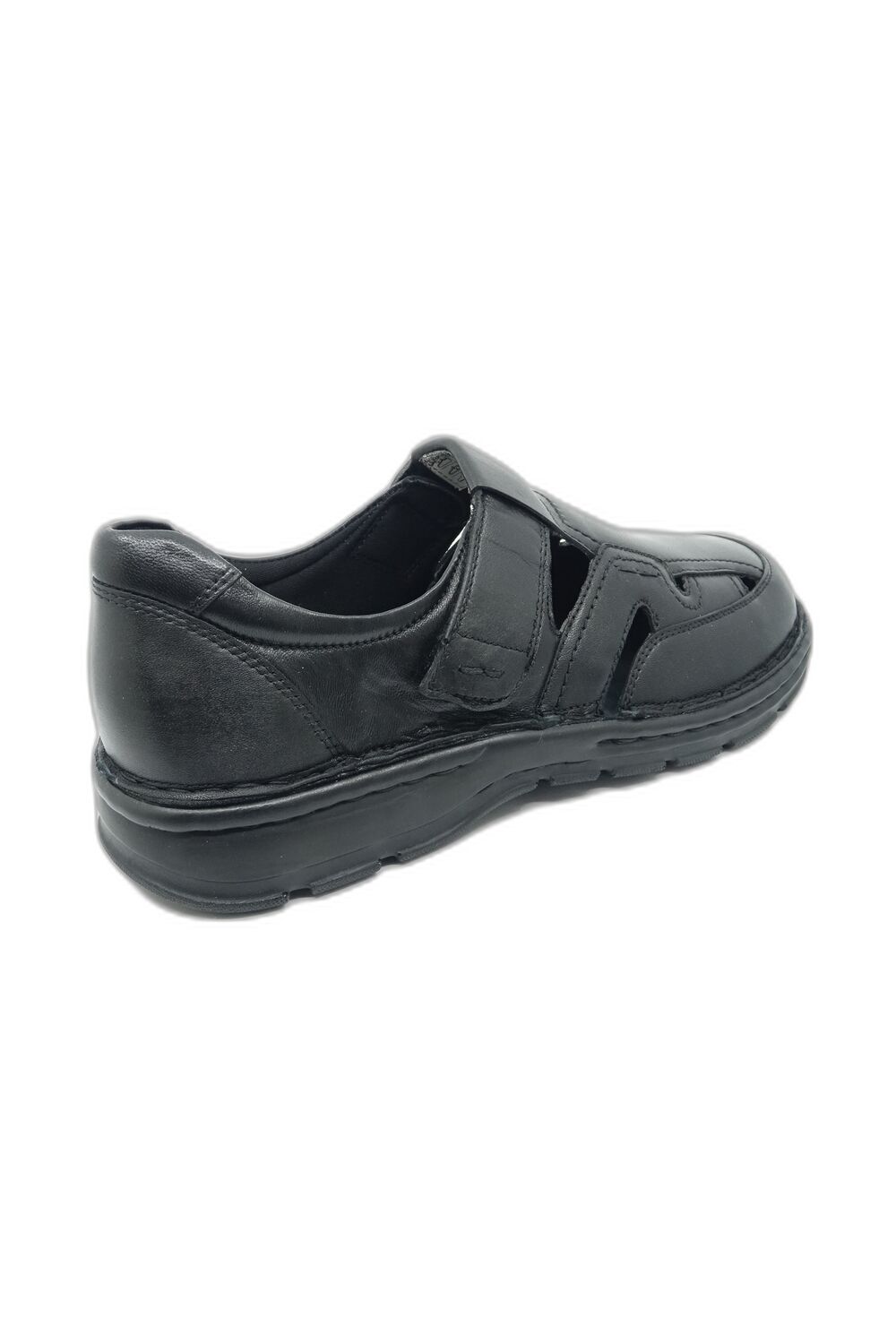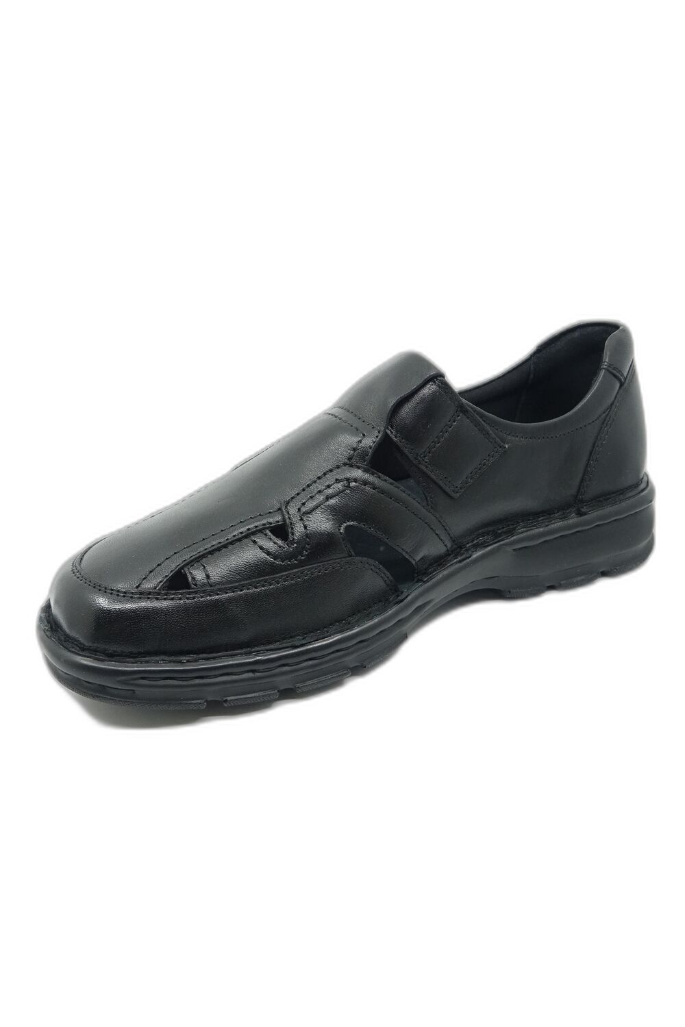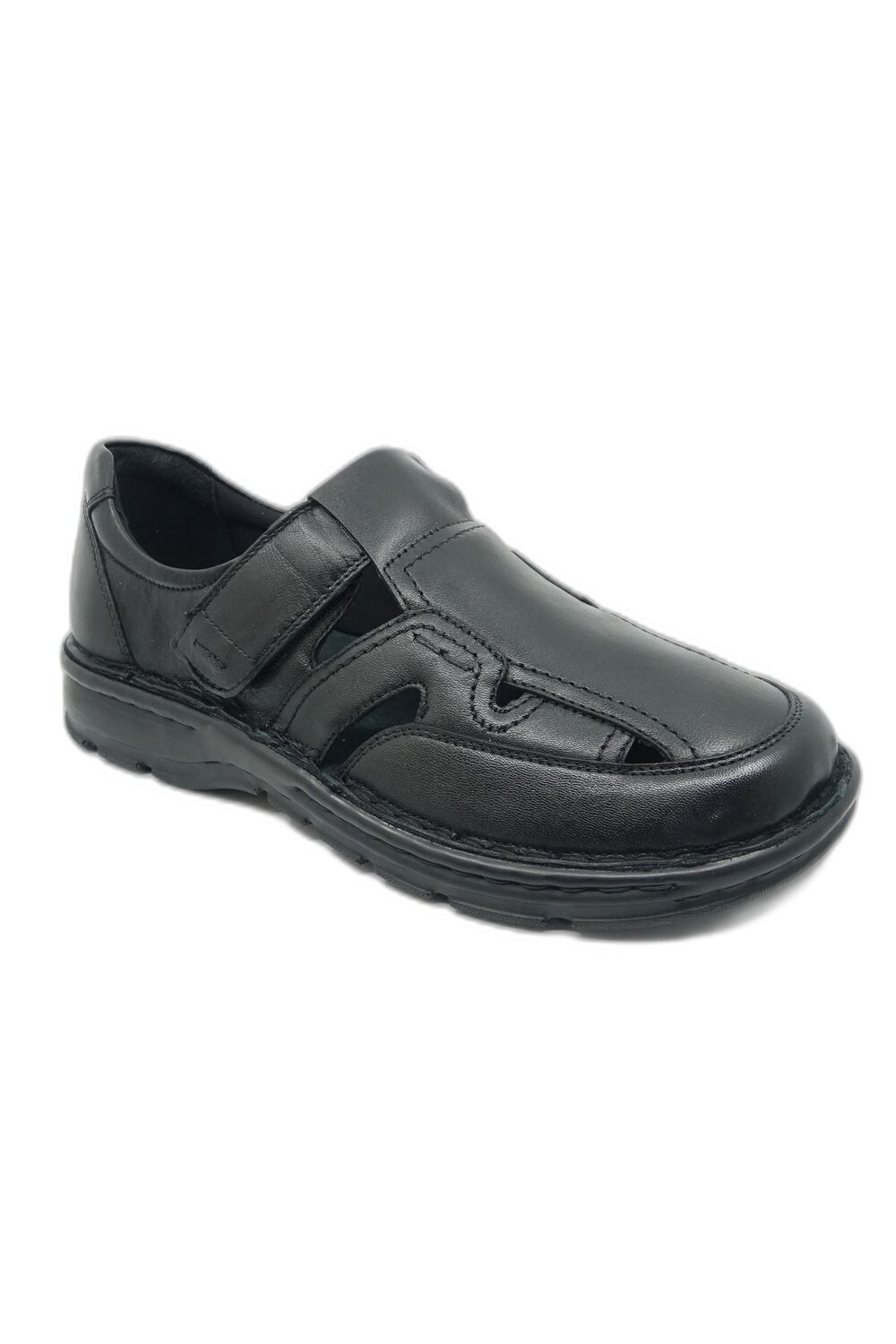 Sandały COMFORTABEL 620021-01 czarny to wygodne, letnie obuwie męskie wykonane ze skóry licowej. W przedniej części cholewki są wycięcia, dzięki temu zachowana jest cyrkulacja powietrza i stopa się nie poci. Pasek na podbiciu zapinany jest na rzep, możemy regulować tęgość dopasowująć ją do tęgości stopy. Wnętrze półbuta wyściełane jest miękką mikrofibrą. Wkładka wykonana jest ze skóry. Lekka podeszwa wykonana jest z tworzywa, posiada dobrą przyczepność do podłoża. W ofercir mamy też klapki na szeroką stopę.