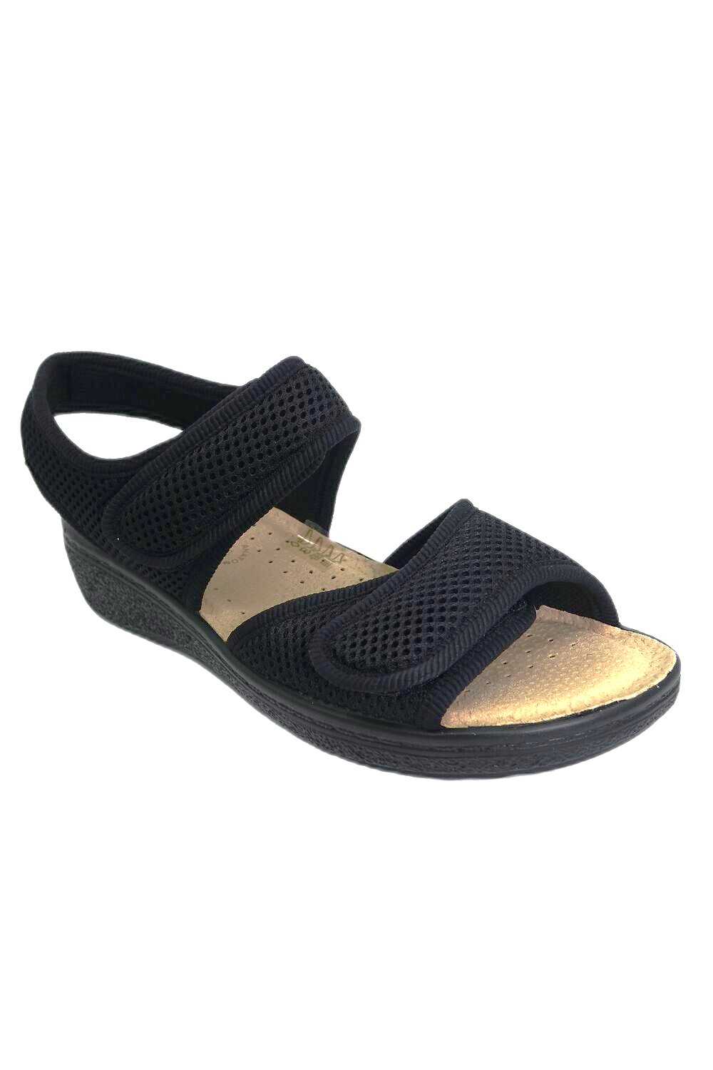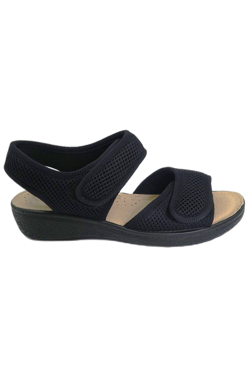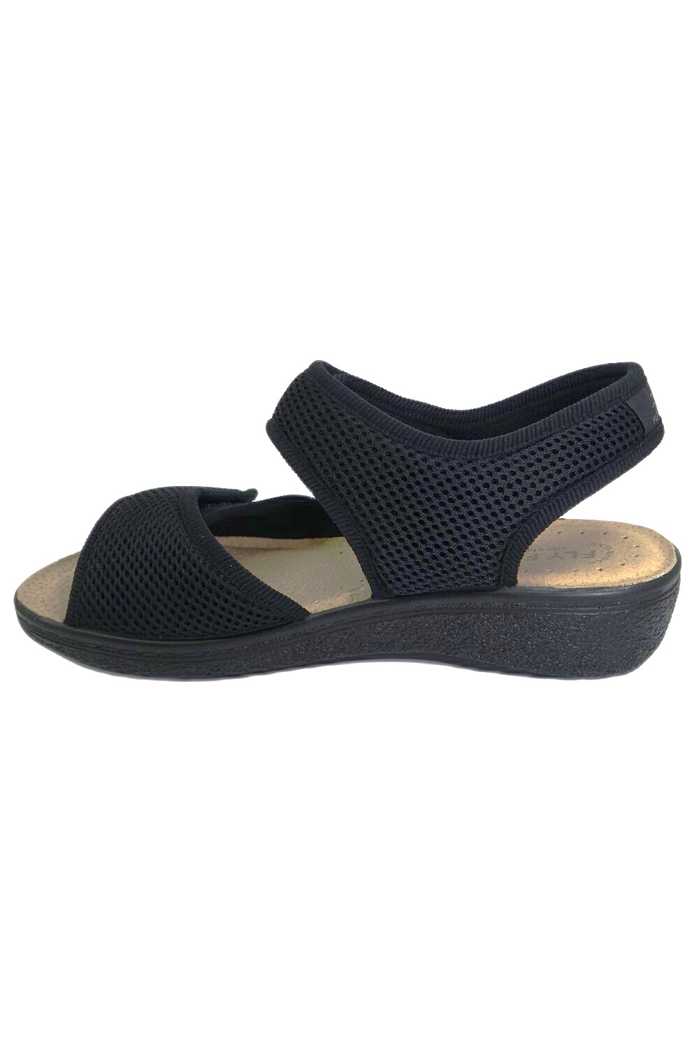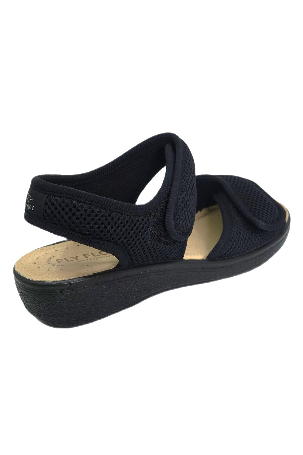 Sandały FLY FLOT 55 H 72 FE czarny to klasyczny model damskiego obuwia letniego wykonany z miękkiego elastycznego materiału. Pasek z przodu i pasek na podbiciu zapinany jest na rzep pozwala wyregulować tęgość i dopasować dobrze buta do nogi. Wkładka zbudowana jest z dwóch warstw, jest to pinka pokryta skórą naturalną. Perforacja na wkładece ma odprowadzać wilgoć, dzięki swej miękkości wkładka odciąża stopę, amortyzuje mikrowstrząsy dając stopie poczucie komfortu. Lekka, elastyczna podeszwa z obcasem w formie delikatnego klina wykonana jest z tworzywa. Posiada dobrą przyczepność do podłoża. W ofercie mamy też wkładki na haluksy.