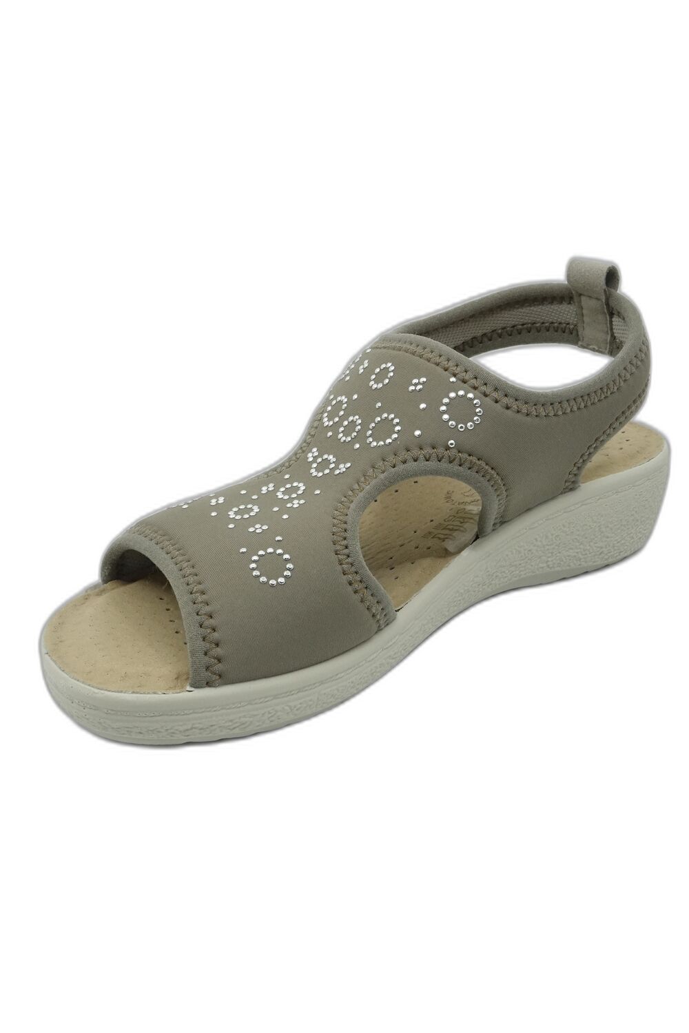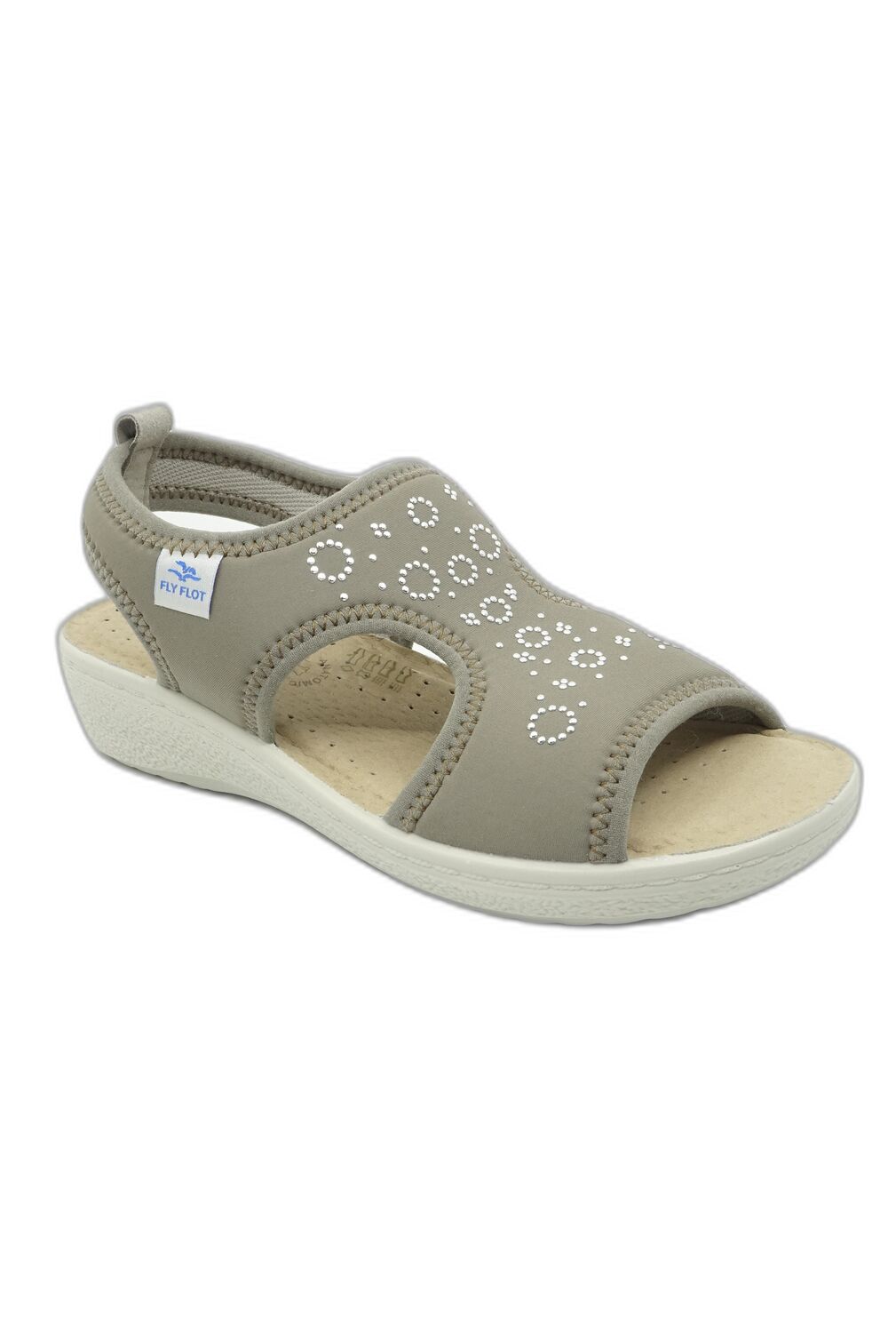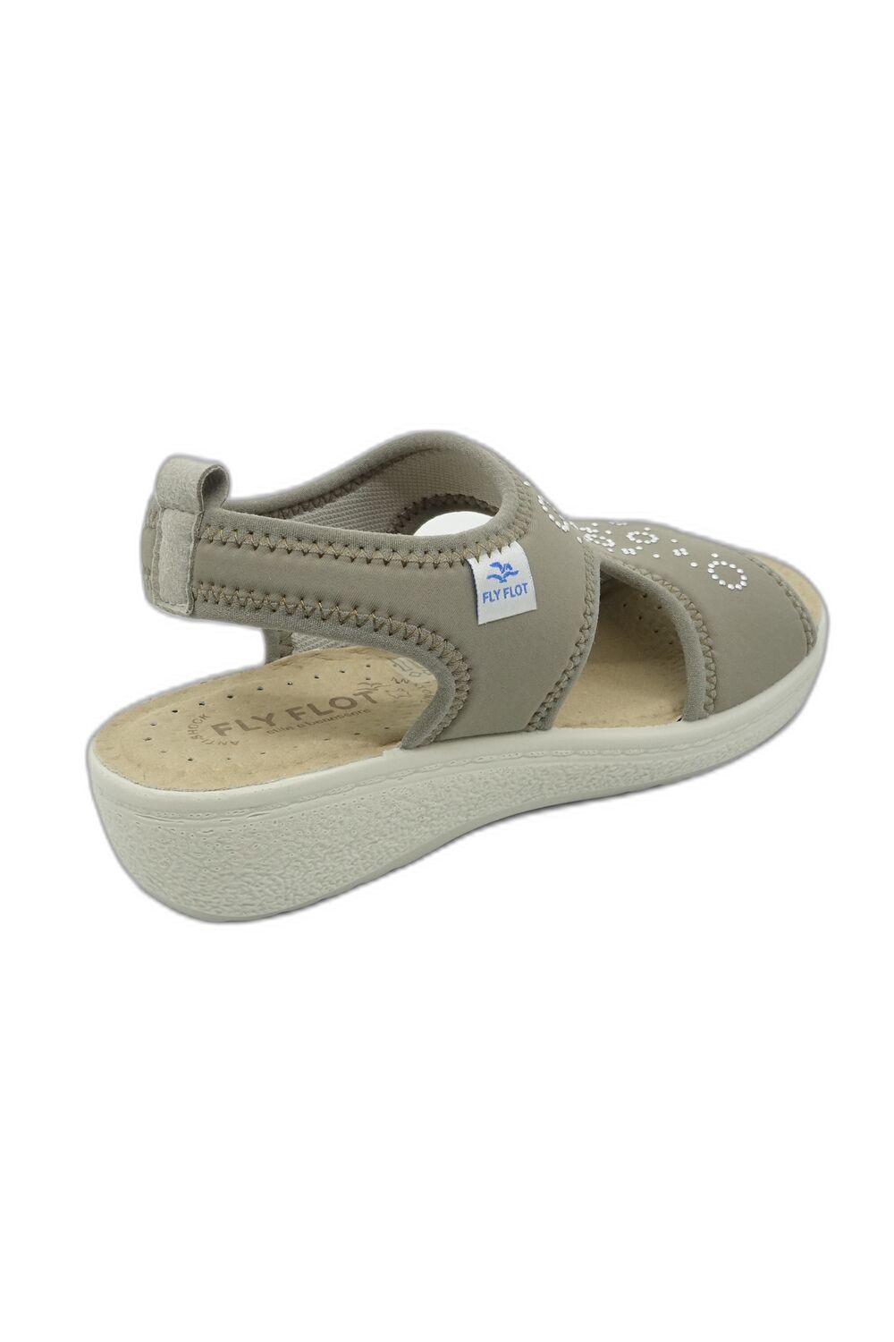 Sandały FLY FLOT 55 H76LE beżowy to wygodny damski sandał wykonany w całości z elastycznego, rozciągliwego materiału, który dobrze dopasowuje się do stopy nie powodując ucisku, ani otarć. Sandały świetnie sprawdzą się przy zwyrodnieniach stóp tj. haluksy, palce młotkowate i inne zwyrodnienia. Wkładka wykonana jest z ergodynamicznego tworzywa amortyzującego wstrząsy od góry pokryta jest skórą naturalną. Posiada anatomiczny profil podperający łuki stopy. Dzięki swej budowie wkładka zapewnia prawidłowe ustawienie stopy, odciąża kręgosłup i stawy, zapewniając stopie pełny komfort nawet przy długotrwałym chodzeniu czy staniu. Wkładka jest wyjmowana, można ją w razie potrzeby zastąpić wkładką indywidualną. Dzięki zastosowanej perforacji stopa ma zapewnioną cyrkulację powietrza. Lekka, elastyczna podeszwa z obcasem w formie delikatnego klina wykonana jest z tworzywa. Posiada dobrą przyczepność do podłoża. W ofercie mamy też klapki na haluksy.