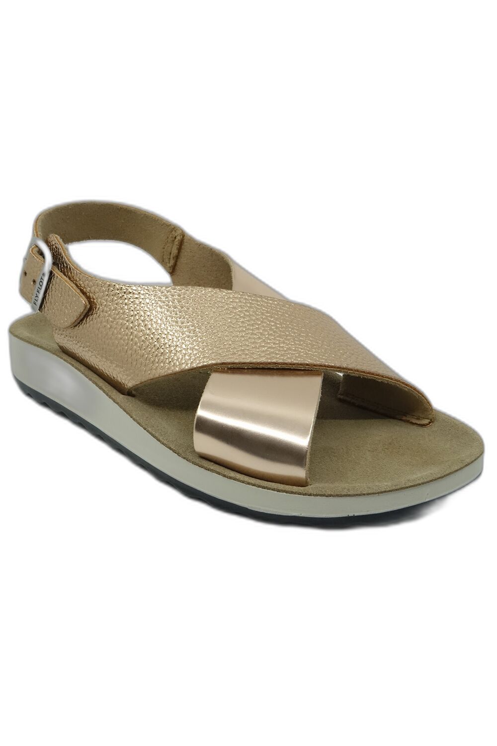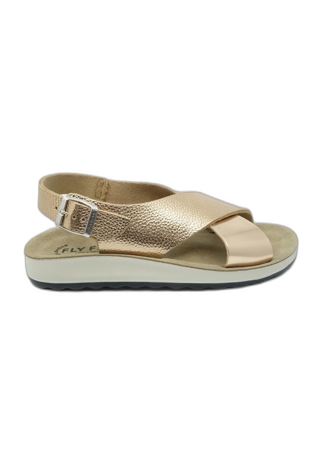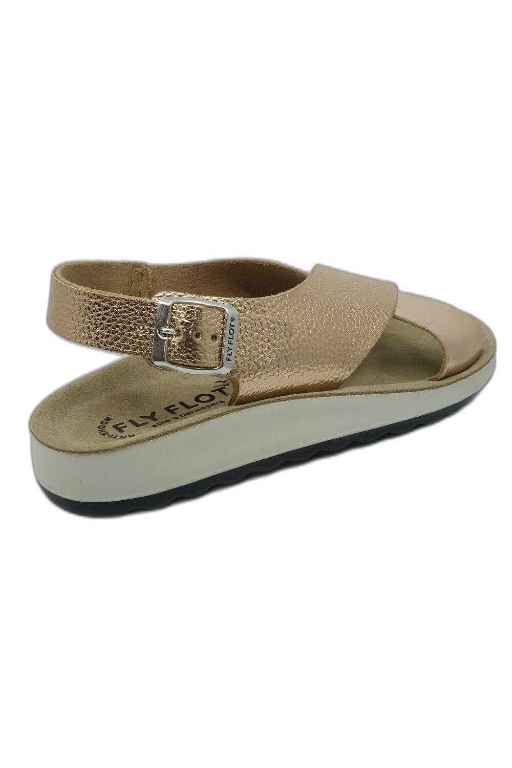 Sandały FLY FLOT 77G61 ZC złoty to eleganckie, wygodne obuwie damskie wykonane z tworzywa skóropodobnego. Wnętrze sandała wyściełane jest miękką tkaniną. Elegancji butom nadaje złoty kolor i połysk. Pasek okalający pięte zapinany jest nasprzączkę. Wkładka wykonana jest ze skóry, posiada anatomiczne wyprofilowanie podpierające łuki stopy, stopa jest odciążona i ma zapewniony komfort. Podeszwa wykonana jest z elastycznego tworzywa, pod piętą zastosowano system antishock amortyzujący mikrowstrząsy powstałe przy chodzeniu. Podeszwa ma dobrą przyczepność do podłoża. W ofercie sklepu mamy też eleganckie buty na szeroką stopę.