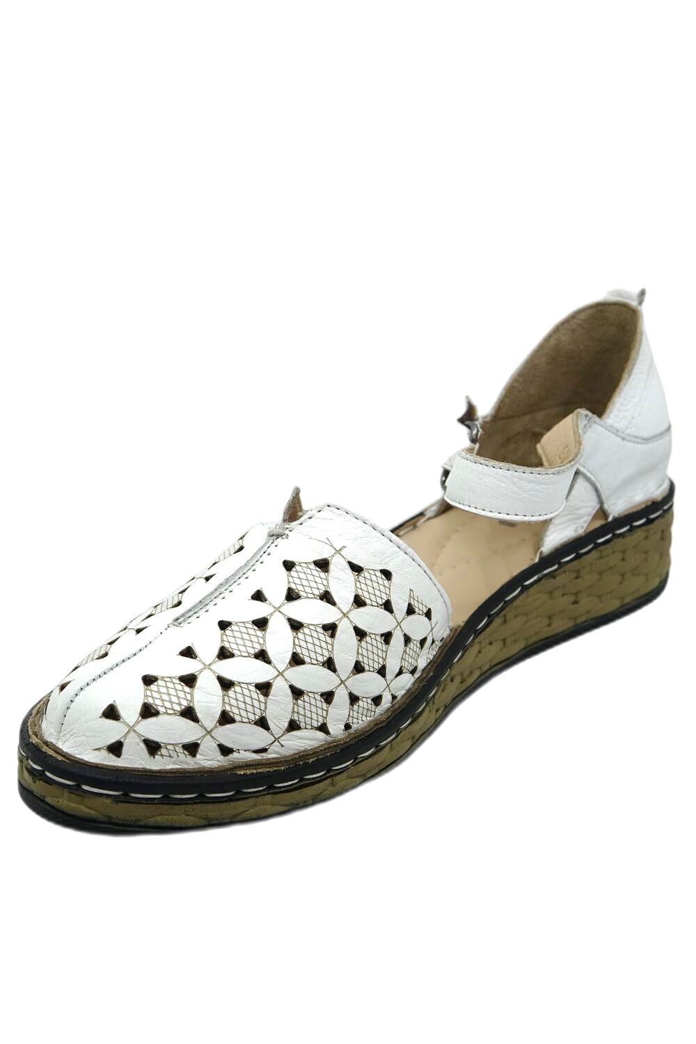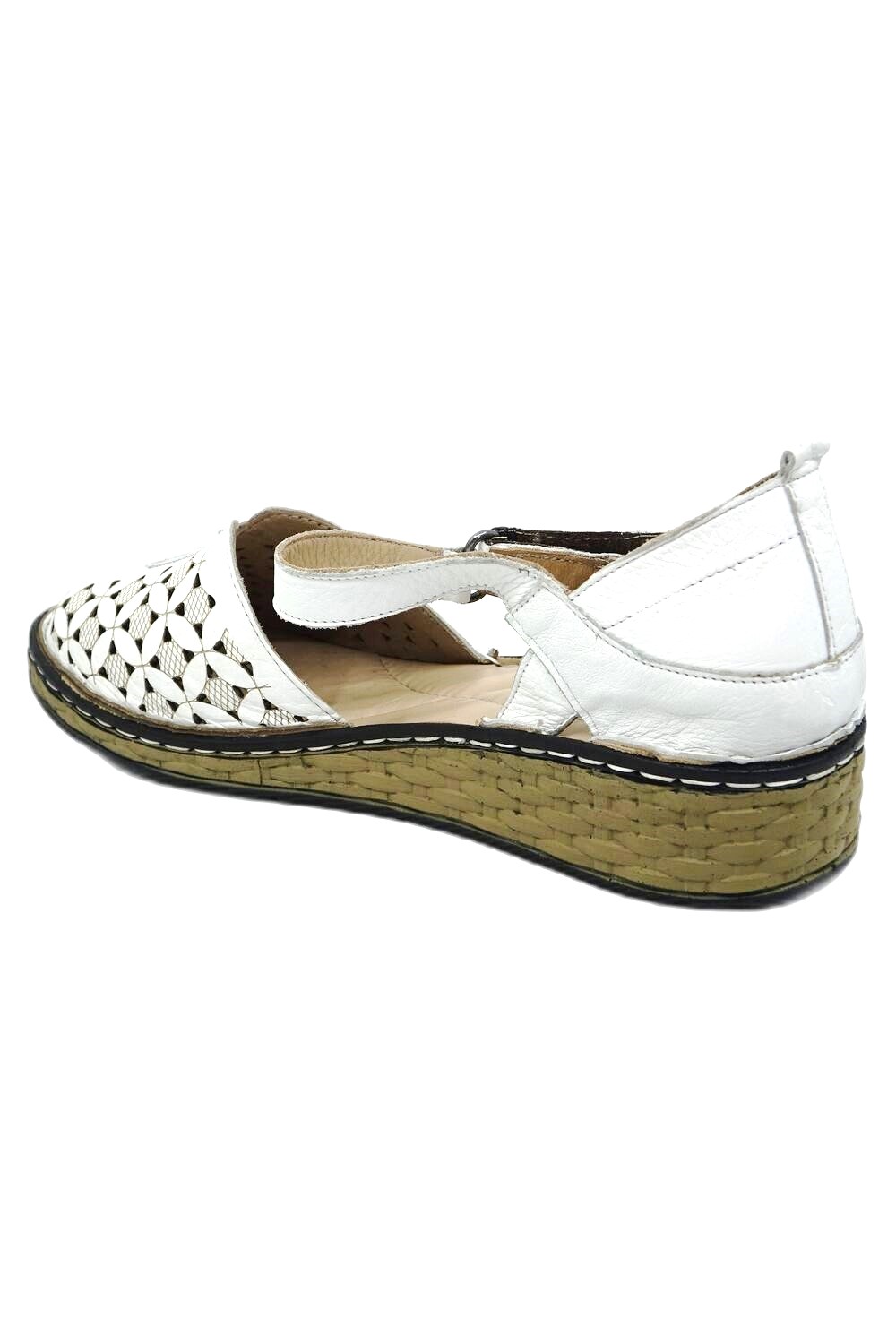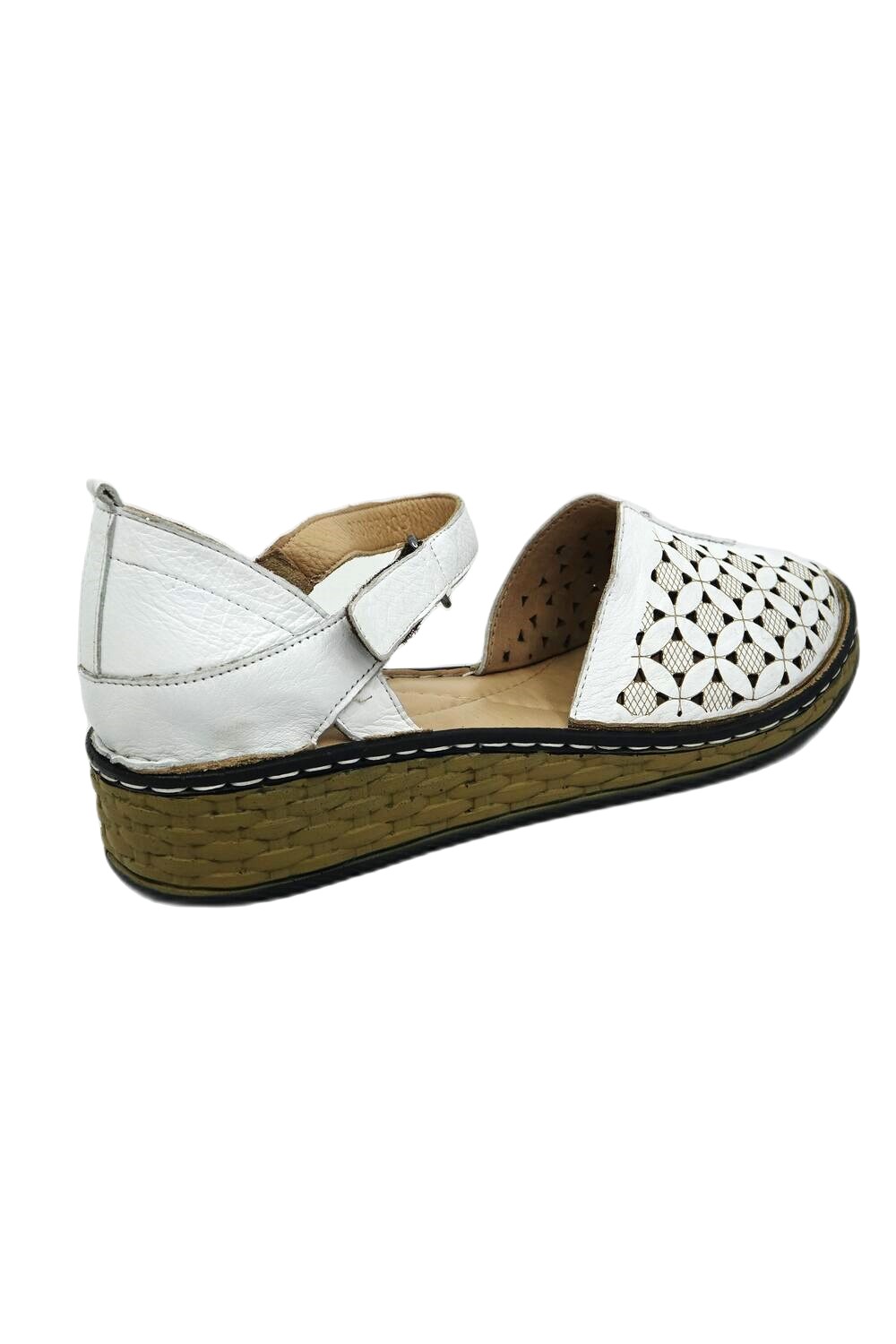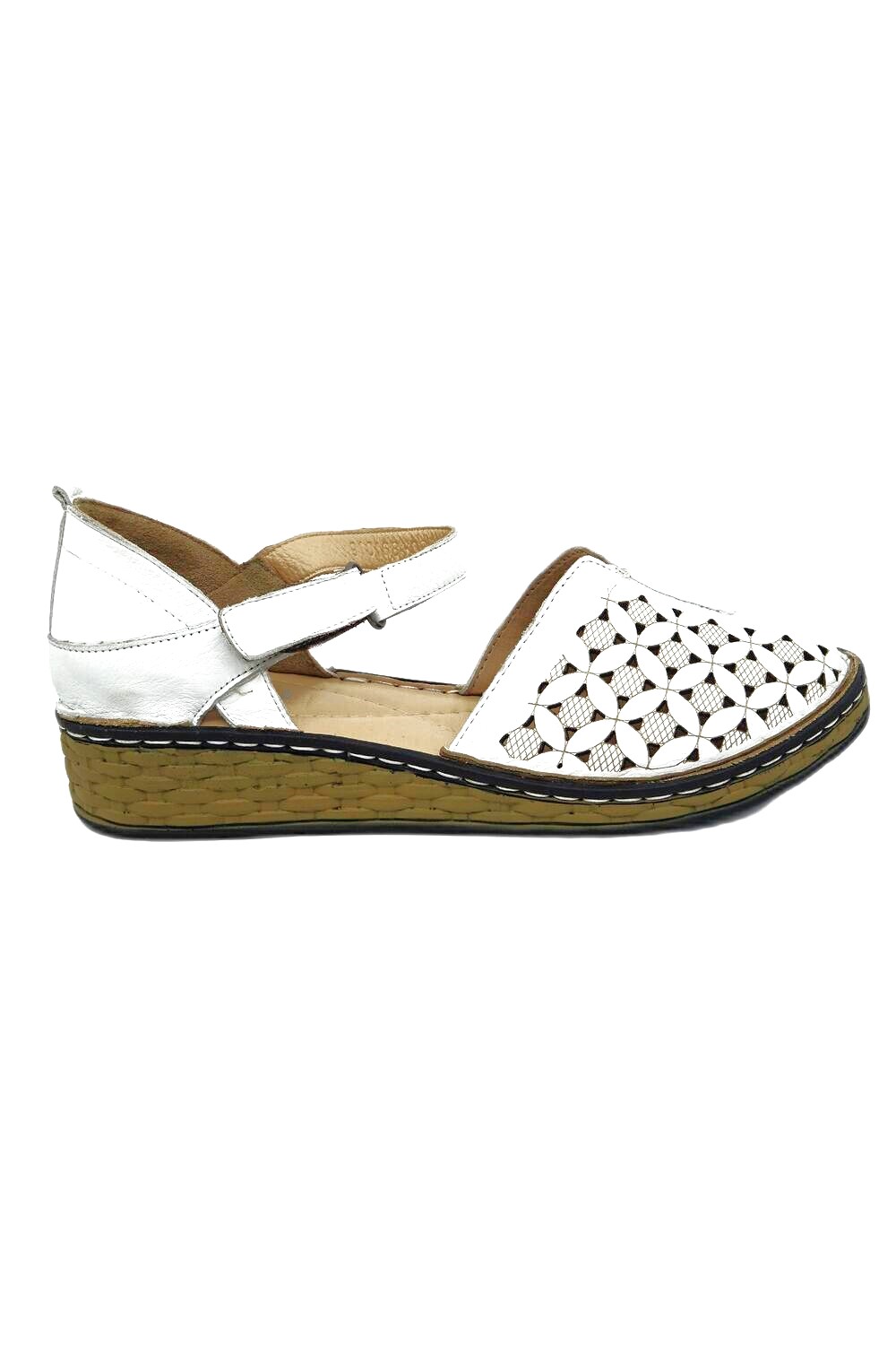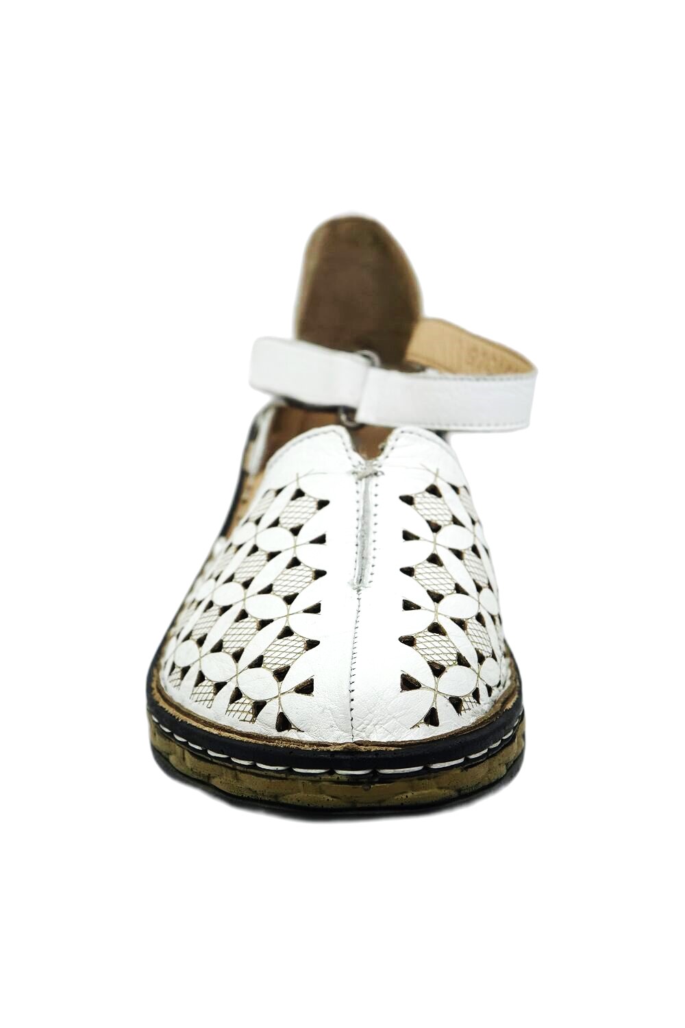 Sandały MANITU 910168-03 biały to eleganckie kobiece obuwie z krytą piętą oraz zakrytymi palcami idealne na okres wiosenno – letni. Wykonane z naturalnej miękkiej skóry licowej. Delikatny ażur dodaje elegancji i finezji. Miękka, skórzana wkładka amortyzuje mikrowstrząsy zapewnia stopie odciążenie i komfort chodzenia. Podeszwa podniesiona odciąży kręgosłup i zniweluje nierówności terenu. Obuwie pasuje zarówno do sukienek jak i spodni. W ofercie mamy też eleganckie buty damskie na haluksy.